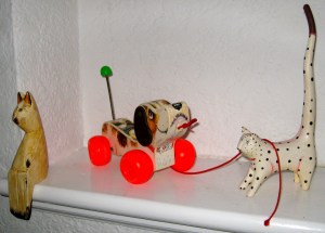 “Just once I would like to go somewhere for vacation,” I told him, “and not just sit around the house watching you with your whiskers in a book, your tail as still as a surfboard on the Oklahoma Panhandle.”At the Wild Animal Park. It’s a Dogoneus. It’s on the Endangered List. “You’re going to be on the endangered list, if you don’t start showing some enthusiasm for this trip,” I told him.At the Cat Dinosaur Museum. “We’re getting smaller and smaller,” he said. “Soon, we’ll be as small as mice. It’s called Existential Evolutionism.” “Is that why you’re always so bummed out?” I asked him.Finally, he had some fun. Here he is on the Cat Teacup Ride.In Japan. “No, it’s not The Beckoning Cat,” I told him. “She’s beckoning me,” he said, “to take her on Antiques Roadshow.” “I can’t take you anywhere,” I told him.At the Colossus of Cats. “It’s not size,” he said, “but the sharpness of claws.”Back home again. He’s doing some research on mice and re-reading all his Black Cat Books. Next year, he wants to visit all the great libraries of the world. I told him he can do that on his laptop. “I want to go dancing across the tierra of Los Angeles,” I told him. He looked at me like I might have cat scratch fever. “There is no earth in Los Angeles,” he said. “Yes, there is,” I said. “You just gotta dig it up.”