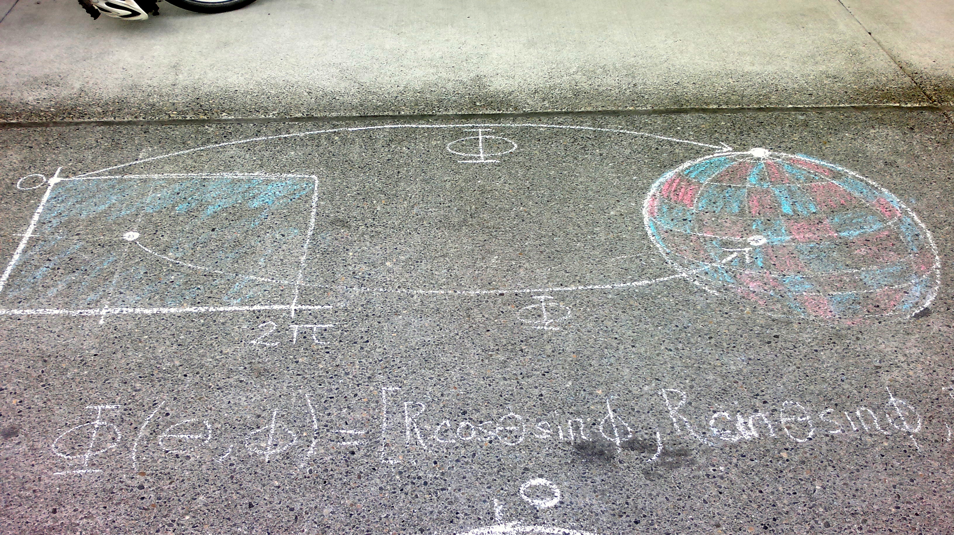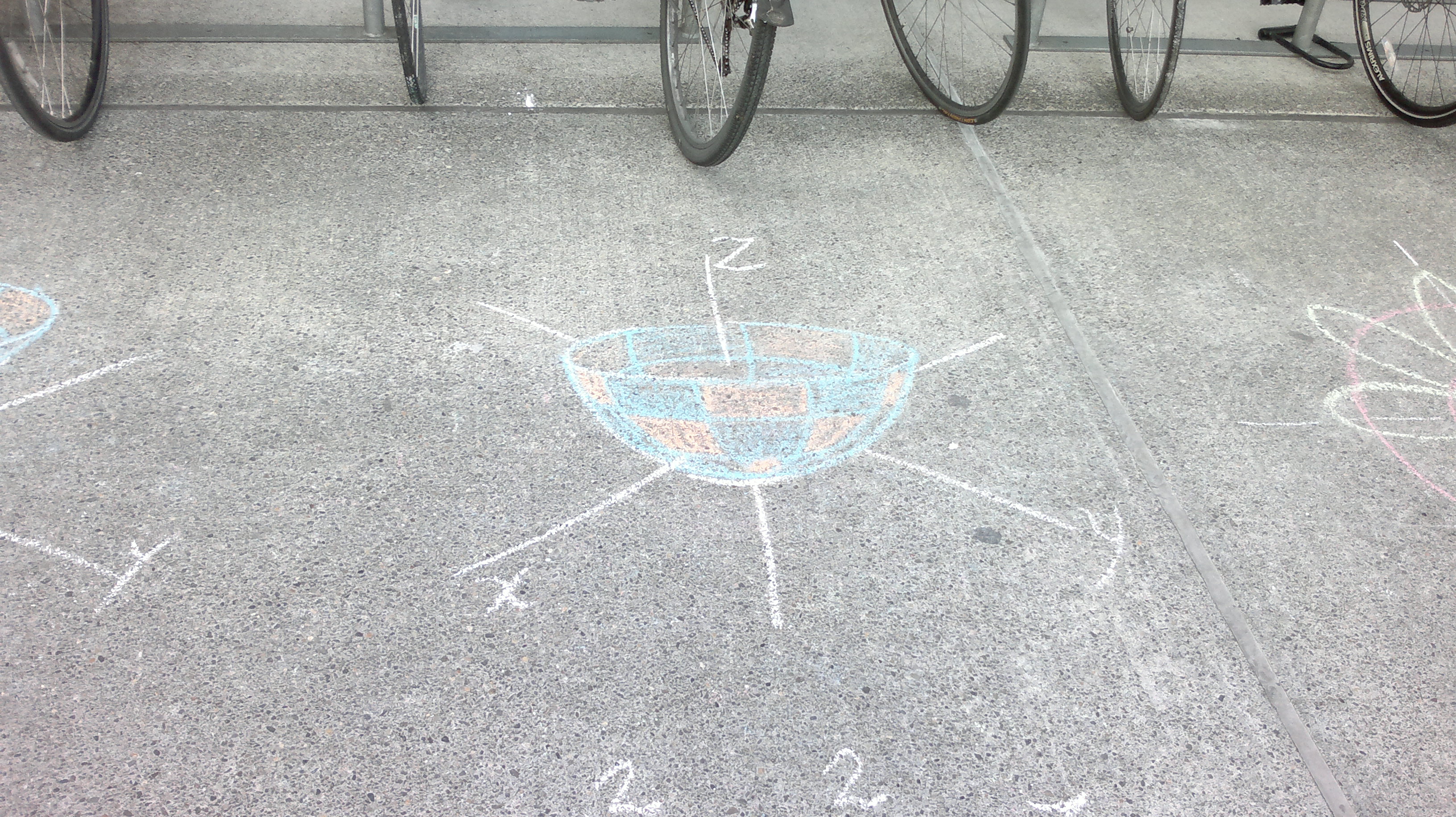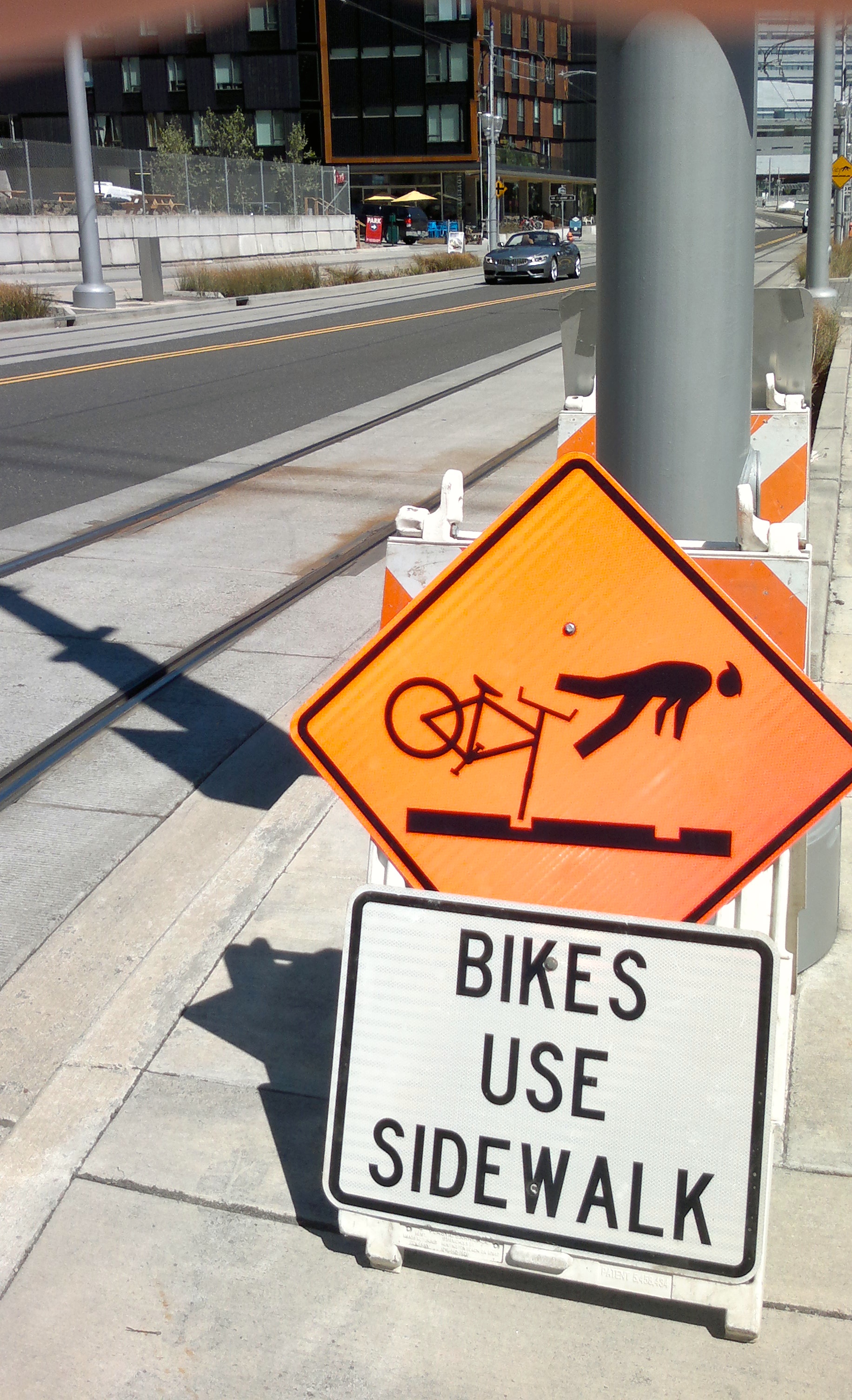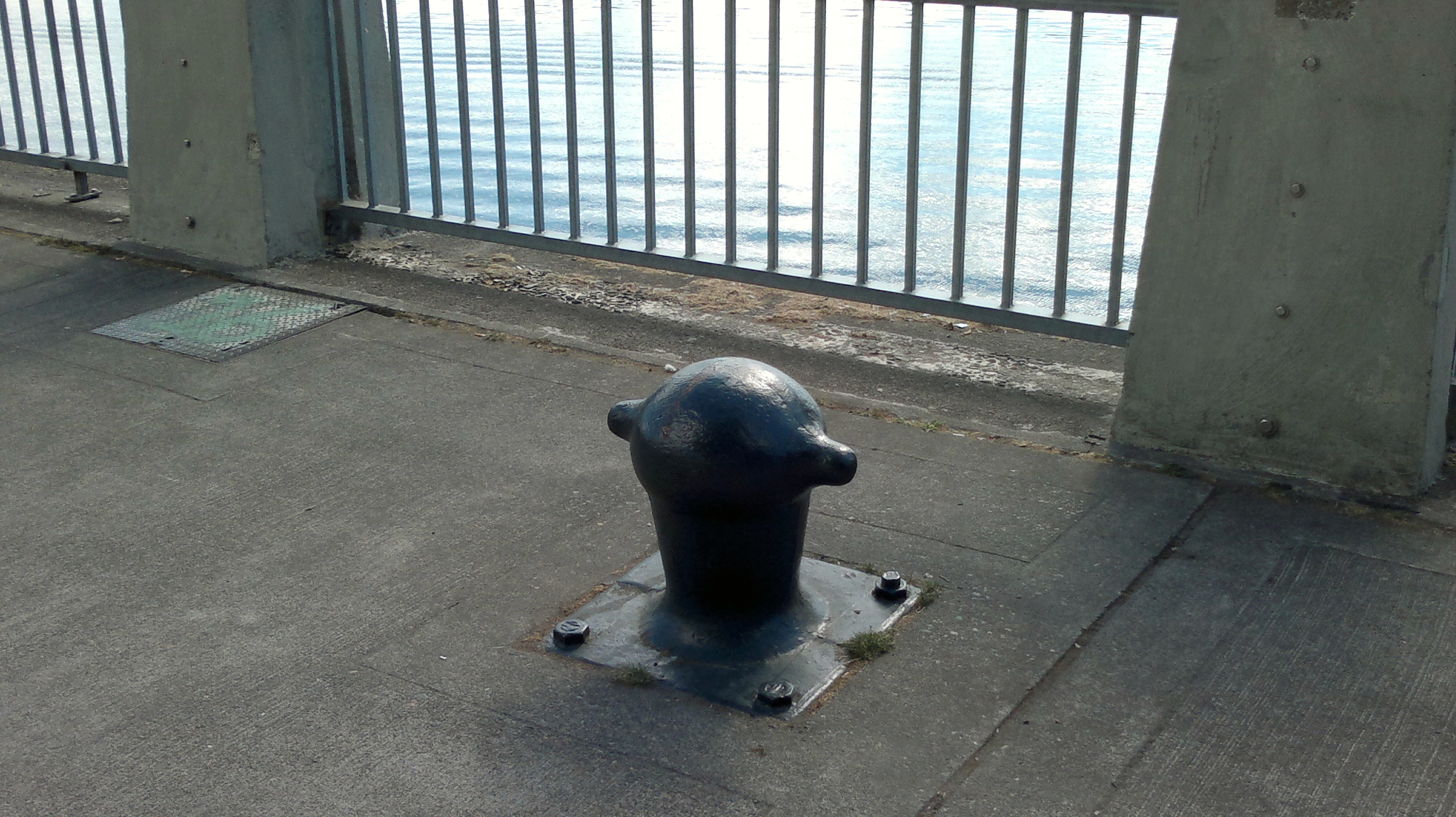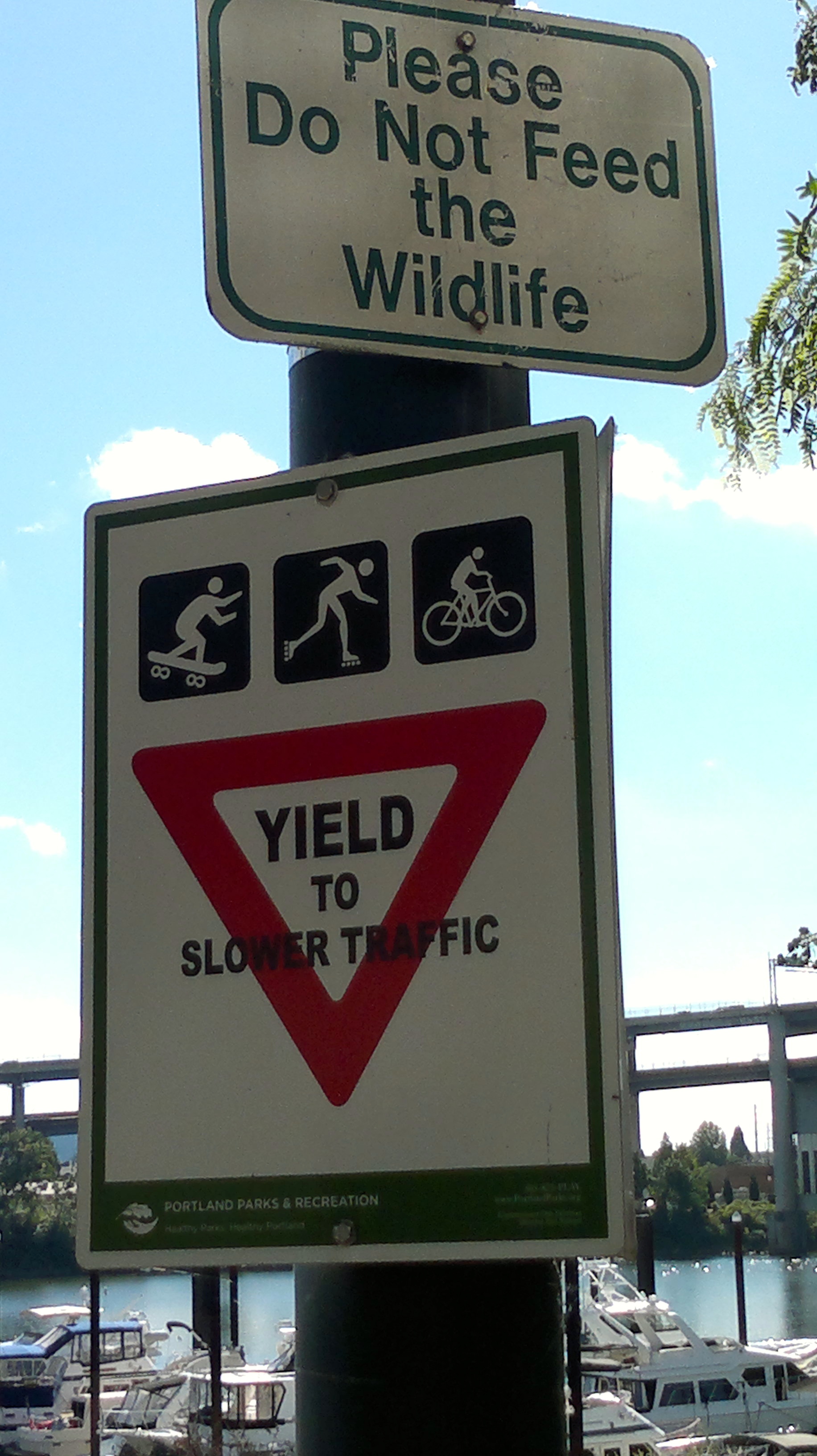 Line 15 currently detours across the Hawthorne Bridge due to a temporary weight restriction on the Morrison Bridge, which is under repair. I hopped off the bus at the west end of the Hawthorne Bridge, passed the Salmon Street Springs Fountain, and walked south along the Willamette to the eye clinic, just over a mile upriver. I saw some strange markings on the sidewalk, as if math really is fun. A gaggle of signs befouled the views, whispering orders, dangers, and cautions. I noticed there were no warning signs near the mooring bollards, and wondered how many people walking along ogling the view have tripped over them. Rarely do I have to yield to slower traffic.