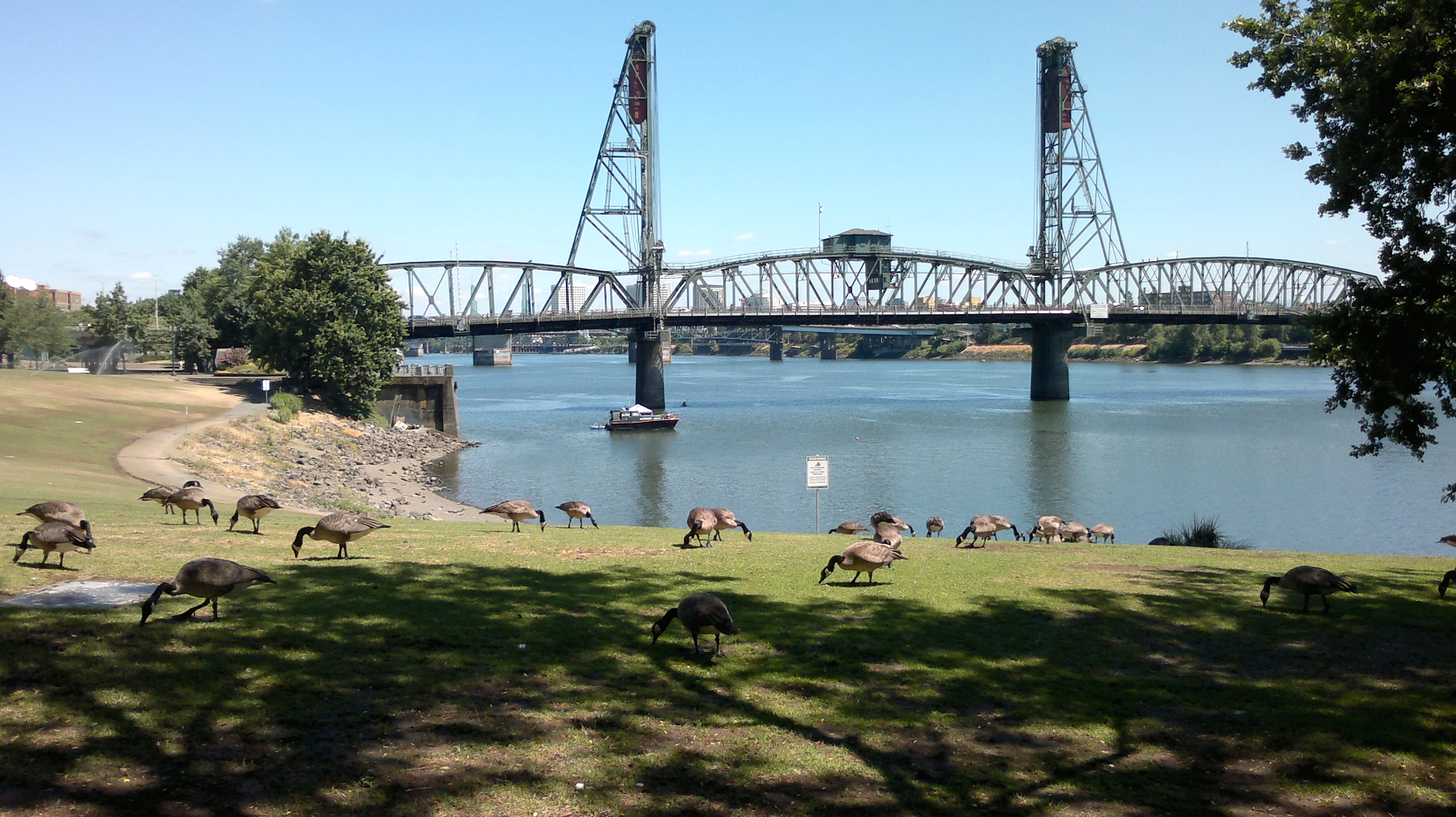 Just south of the Hawthorne Bridge, I noticed an interesting, kind of improvised, lean-to-dock moored just off the west bank between the bridge and the park beach, downriver from the yacht harbor. The boat and dock set-up reminded me of Anais Nin’s “Houseboat,” and of Penelope Fitzgerald’s “Offshore.” And the usual gaggle of geese casually befouled the park beach area. I don’t mind the geese, though the city has been taking precautions to minimize the goose poop problem. But I was wearing the new Fila walking shoes Susan recently scored for me, and I wasn’t sure the goose path was how I wanted to break them in. Portland is called the City of Roses. You would think the roses wouldn’t mind the geese.