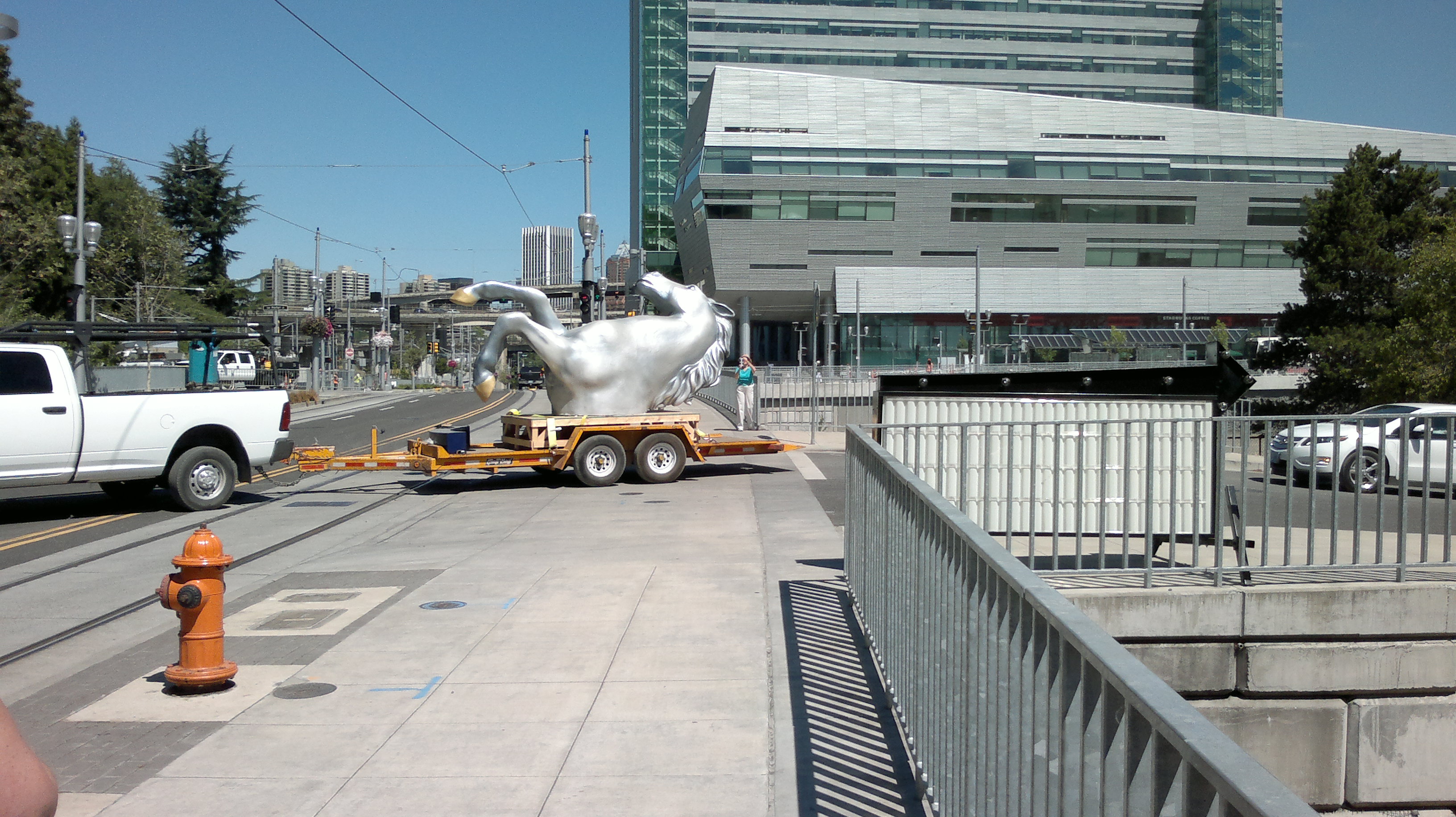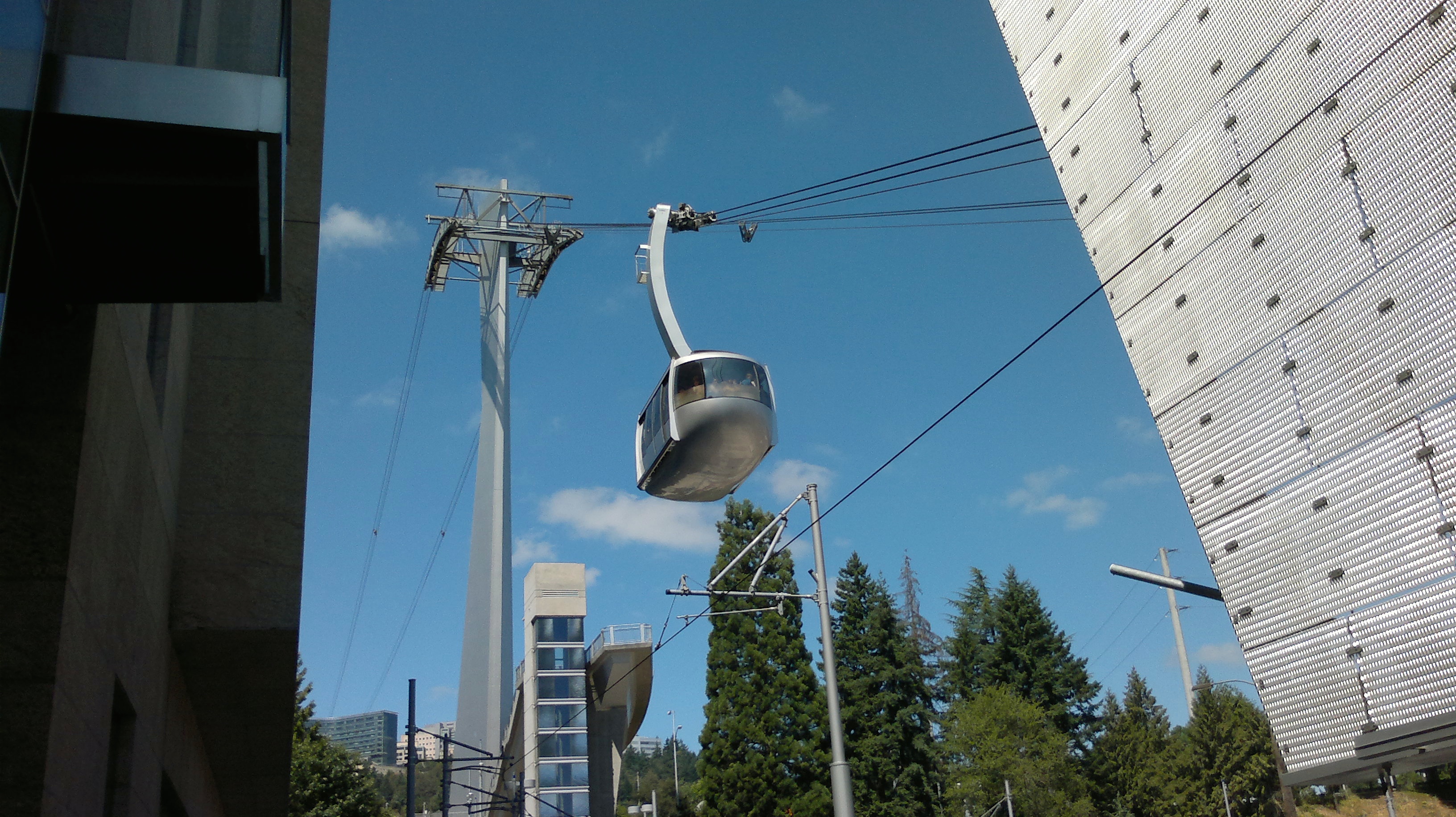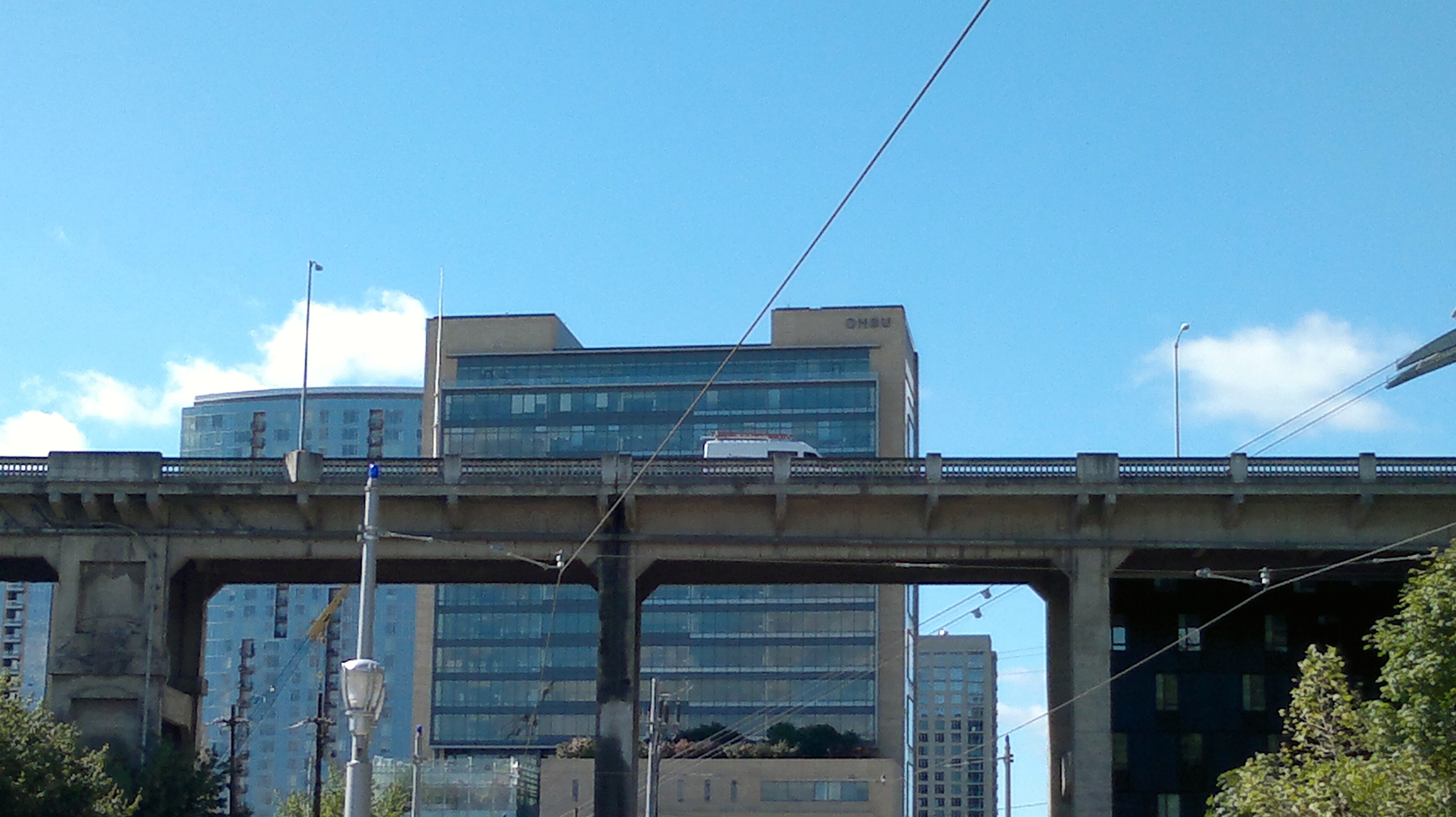 A rowing crew rounded the pilings of the Marquam Bridge (a concrete brouhaha that spans and expands the definition of bridge), the submarine moored behind them on the east bank, below OMSI and the Portland Opera. The Pabst Horse trotted off on a trailer. The Portland Aerial Tram (constructed at a cost of $57 million), juxtaposed with the old Ross Island Bridge, reminded me of the 20th Century: “Turn! Turn! Turn! (To Everything There Is a Season)”.