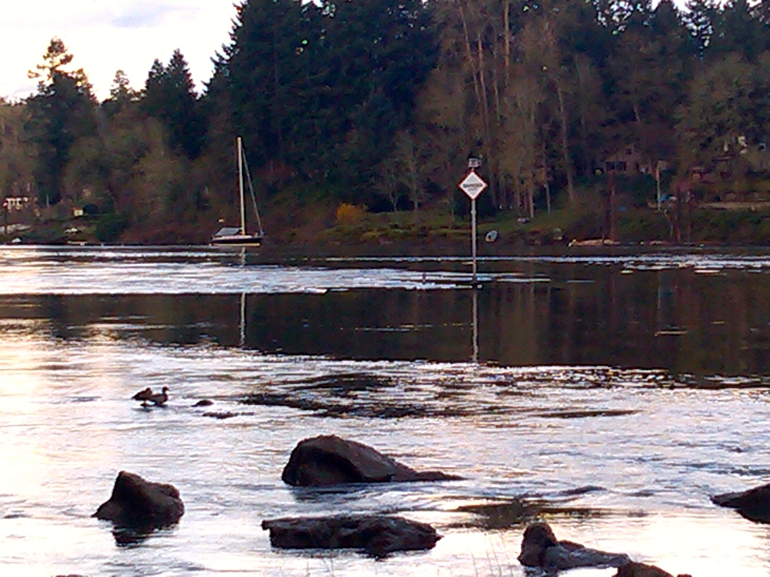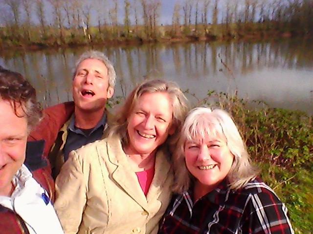 The four of us shared a carafe of house Chianti and ate lasagna, pasta with clam and tomato sauces, fresh oven hot bread, salads and minestrone soup. We sat upstairs, at a booth in the bar area, paying scant attention to the river slooming below about sixty feet to the east. After dinner, we took a short, giddy walk along the river and paused for a few silly, group selfies with the island in the background.