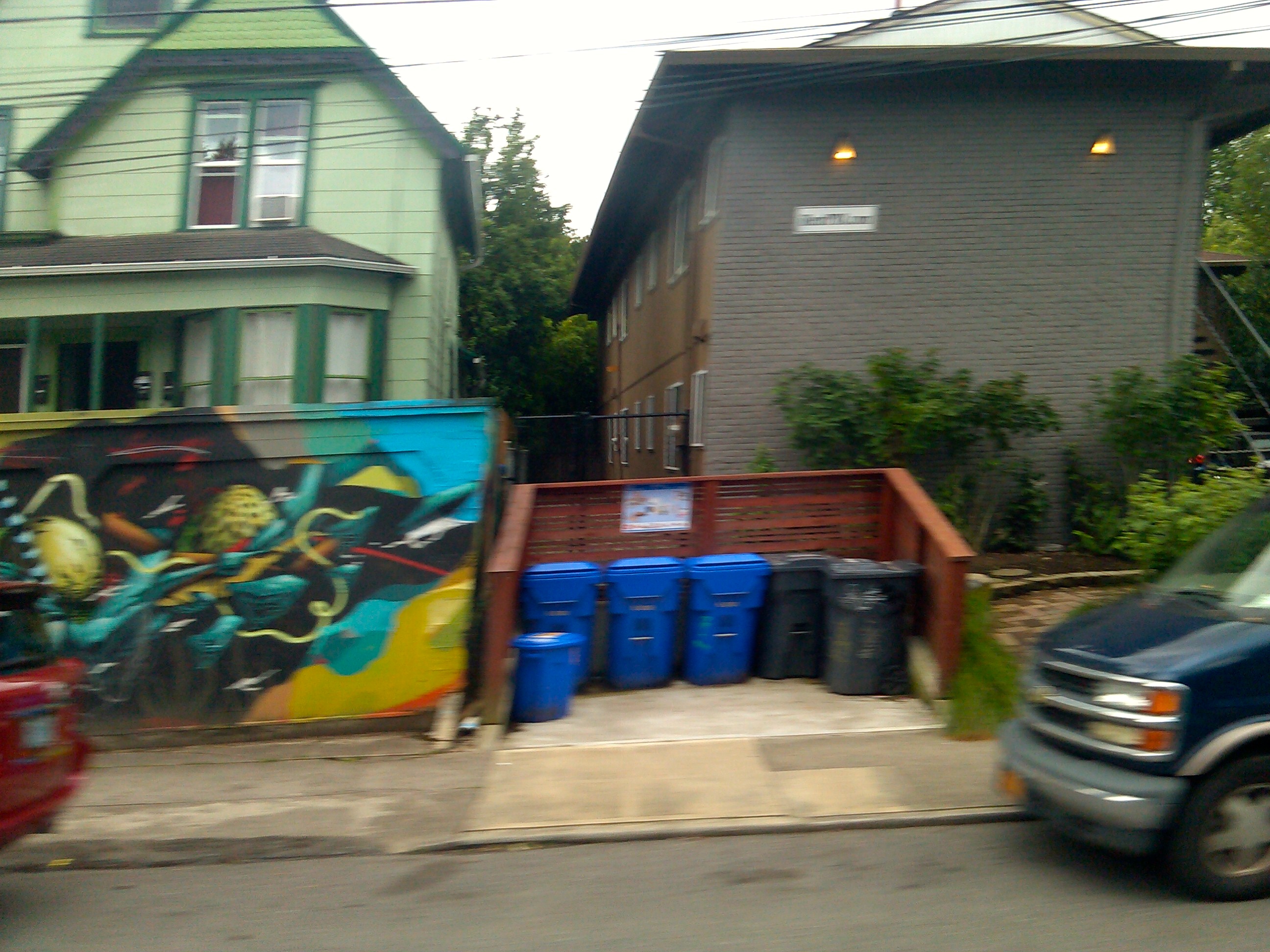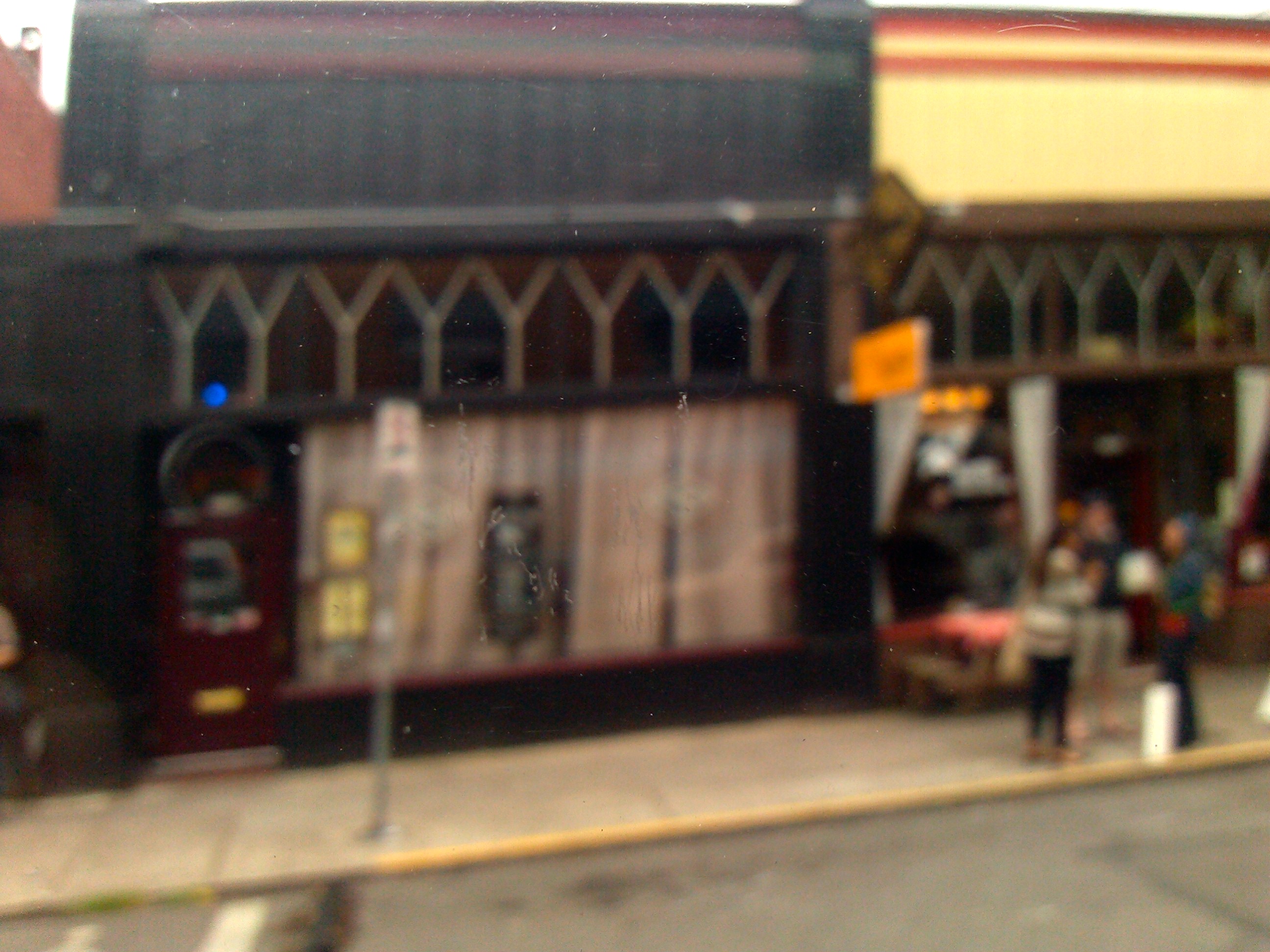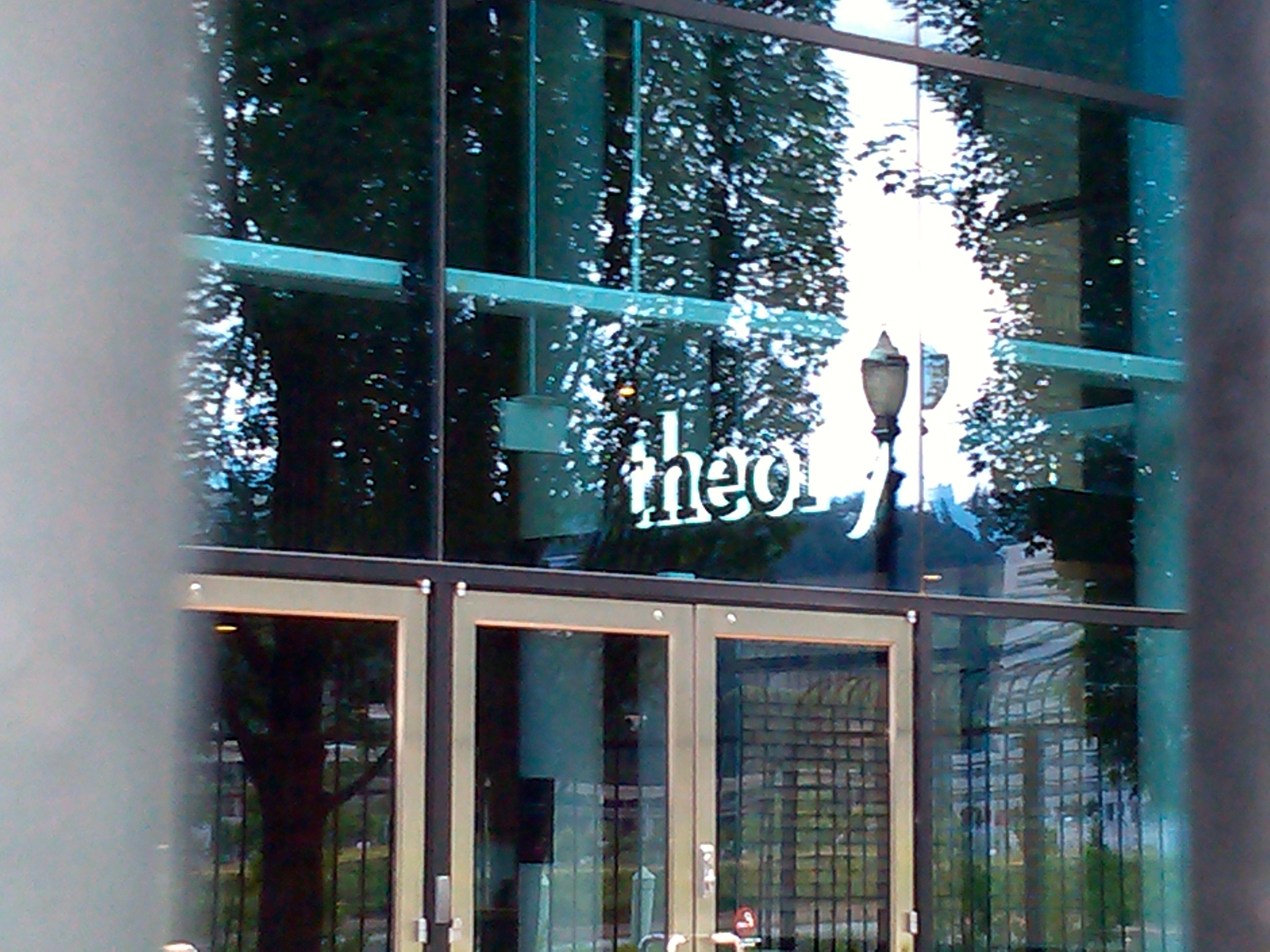 I didn’t get any pics while driving, driving a car these days multi-tasking enough as it is. The few pics I’d taken of the south side of Belmont, from the bus, came out blurry, not too brilliant. I tried to get a few murals, and a couple of the old buildings, the ones the developers, none too brilliantly some have been arguing, are in a hurry to tear down. We passed a typical east side tavern. I realized I have my shutter delay set too long. I had to anticipate where the bus would be when the shutter finally clicked. At the river I saw the lean-to boat setup again, and tried to get a contrast pic of the east side boat in the foreground with the west side yachts in the background. I paused at the OMSI sign to repeat Oṃ maṇi padme hūṃ a few times, feeling even less brilliant as I moved on. I never tire of the sign of Theory, and took yet another pic of it. The blue building was brilliant in the soft afternoon overcast light.