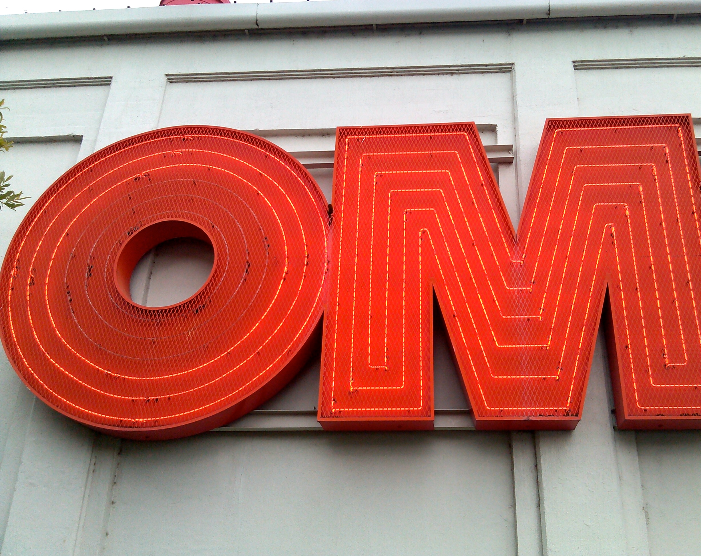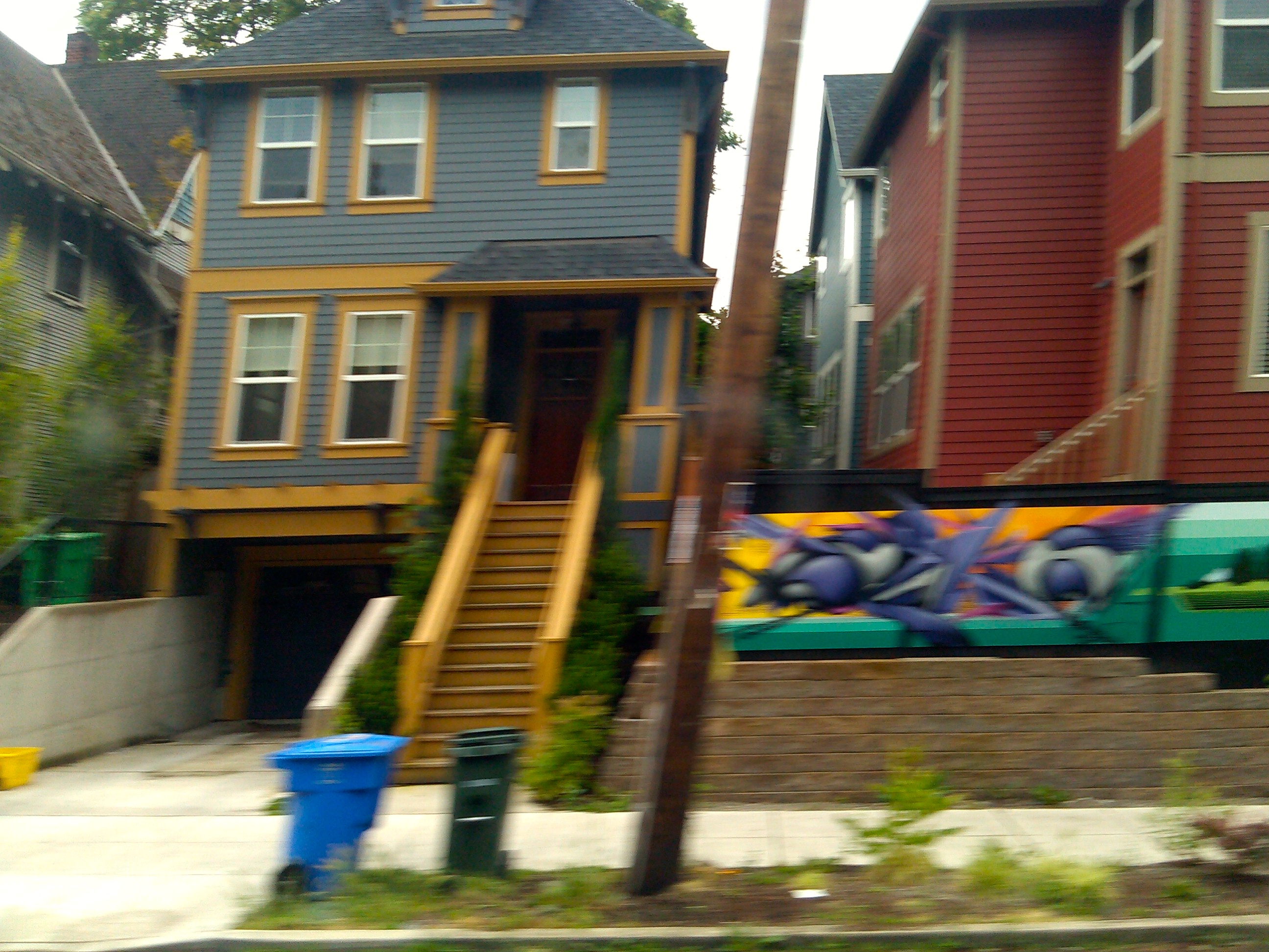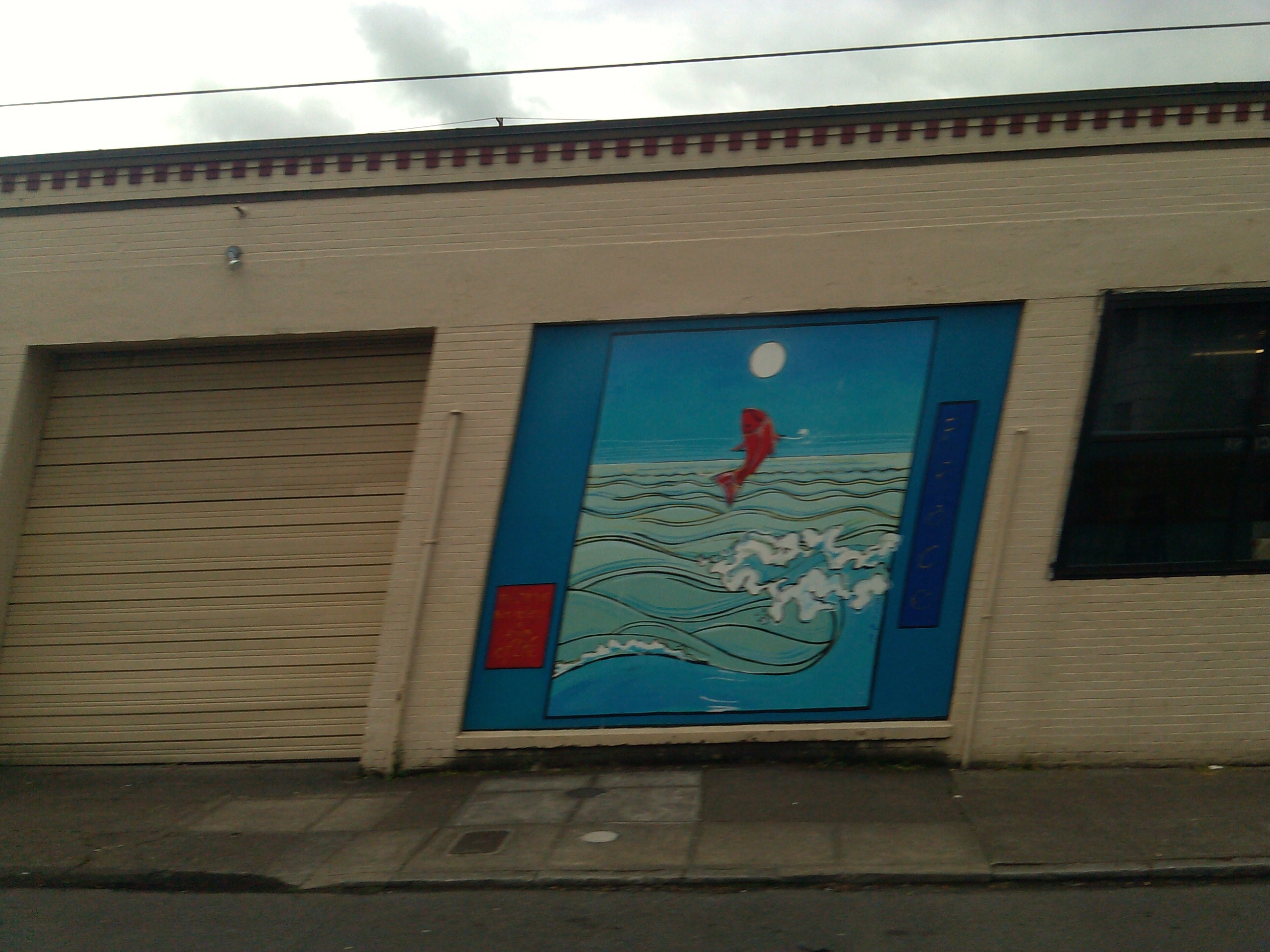 I didn’t get any pics while driving, driving a car these days multi-tasking enough as it is. The few pics I’d taken of the south side of Belmont, from the bus, came out blurry, not too brilliant. I tried to get a few murals, and a couple of the old buildings, the ones the developers, none too brilliantly some have been arguing, are in a hurry to tear down. We passed a typical east side tavern. I realized I have my shutter delay set too long. I had to anticipate where the bus would be when the shutter finally clicked. At the river I saw the lean-to boat setup again, and tried to get a contrast pic of the east side boat in the foreground with the west side yachts in the background. I paused at the OMSI sign to repeat Oṃ maṇi padme hūṃ a few times, feeling even less brilliant as I moved on. I never tire of the sign of Theory, and took yet another pic of it. The blue building was brilliant in the soft afternoon overcast light.