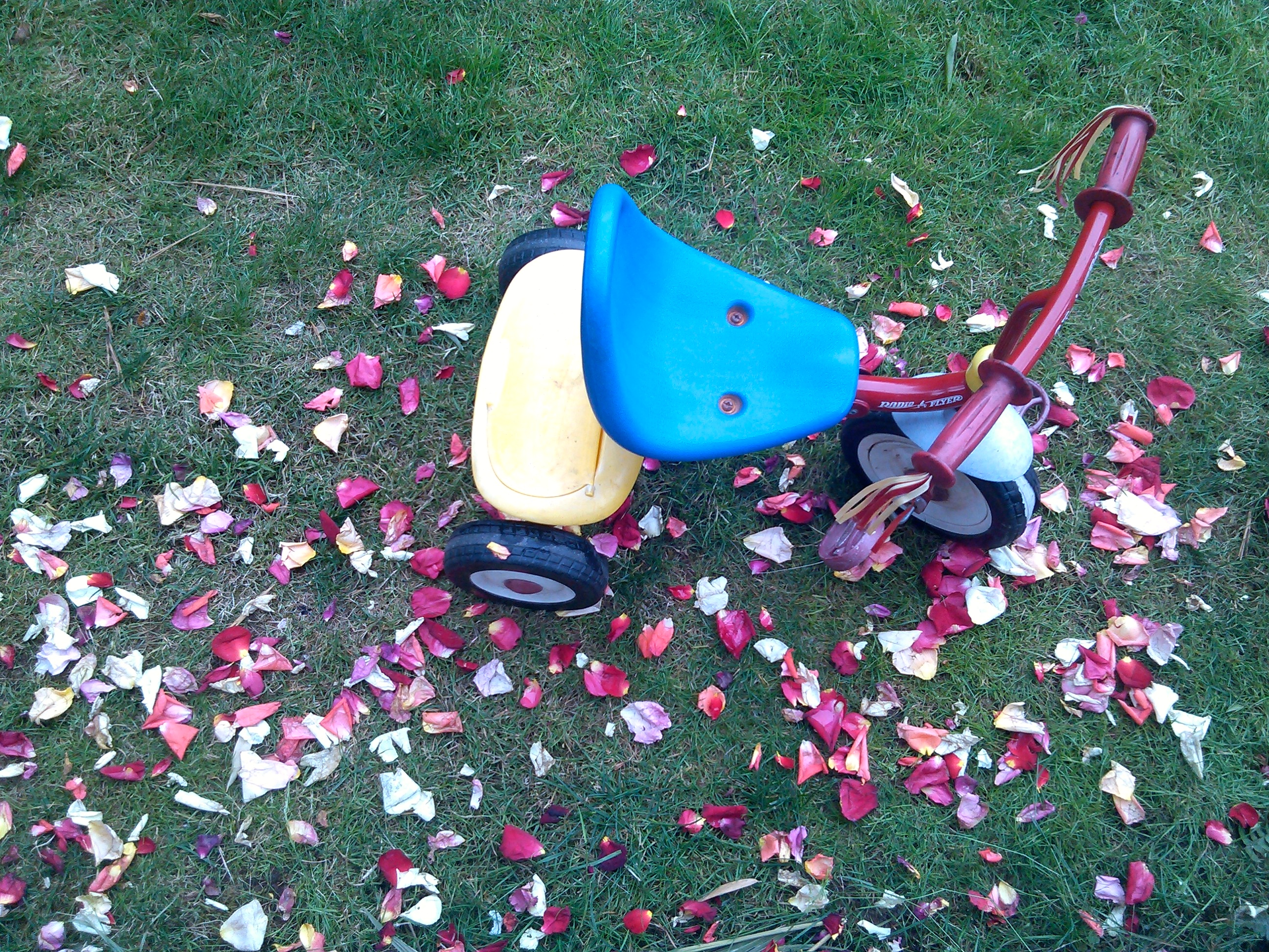 In Em’s yard, I took some pics of a flowering tree and a tricycle rained in rose petals. It’s almost dragonfly season here, and I thought how nature always seems sufficiently brilliant, yet also always seems to be becoming more brilliant. Nature is superlative, while we can only ever be comparative, until we remember that we are also part of nature, where we are most brilliant.
