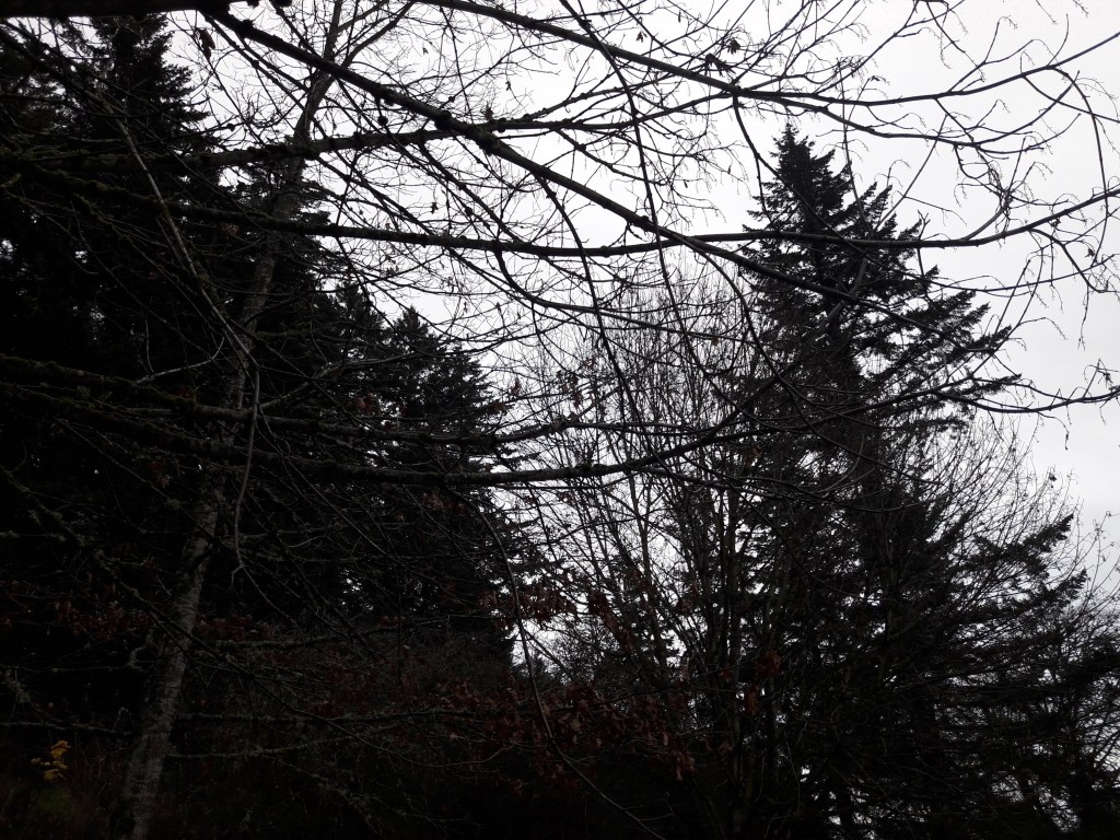 Cold. Wet and damp. Dark. Slippery walk in Mt Tabor Park, where the trees appear ready for the winter solstice.