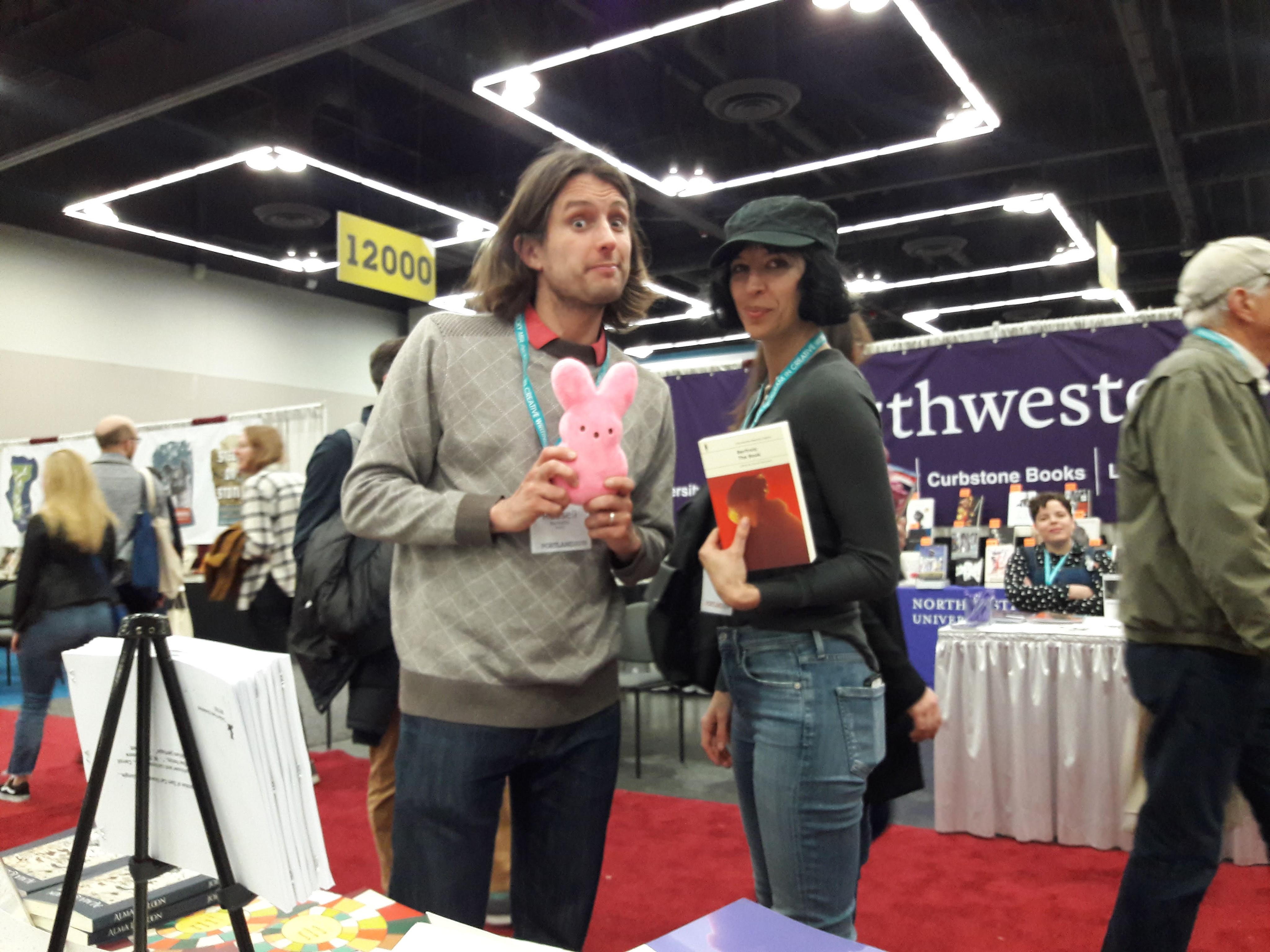 I arrived a bit early for my scheduled stint to help out at the Berfrois table at AWP19, so I wandered through a few aisles of tables set up for the book fair. At each table, a couple of usually amiable greeters happily and professionally described the occasion or purpose of their press or otherwise writing or teaching venture. The number of tables was daunting. If 6 was 9 there wouldn’t be time to peruse them all. In the lobby, the wait in the long, long line reminded me of the line for a ride at an amusement park, a long stretch of individuals lined out through the main rotunda, waiting to enter the ticket area, where the line then snaked through numerous switchback turnstile aisles. My friend Bill, who had arrived early, said he’d waited in line for two hours. He voiced his complaint to us at the Berfrois table. As T. S. Eliot might have said, had he not been so gloomy, “I had not thought spring had undone so many.” The sun was out in Portland town. The only way to proceed was at random, psychogeographically. The book fair of course is only one event at any AWP. I enjoyed my short wander, but it was a bit like shopping, which I don’t much care for. Life is subject to change.