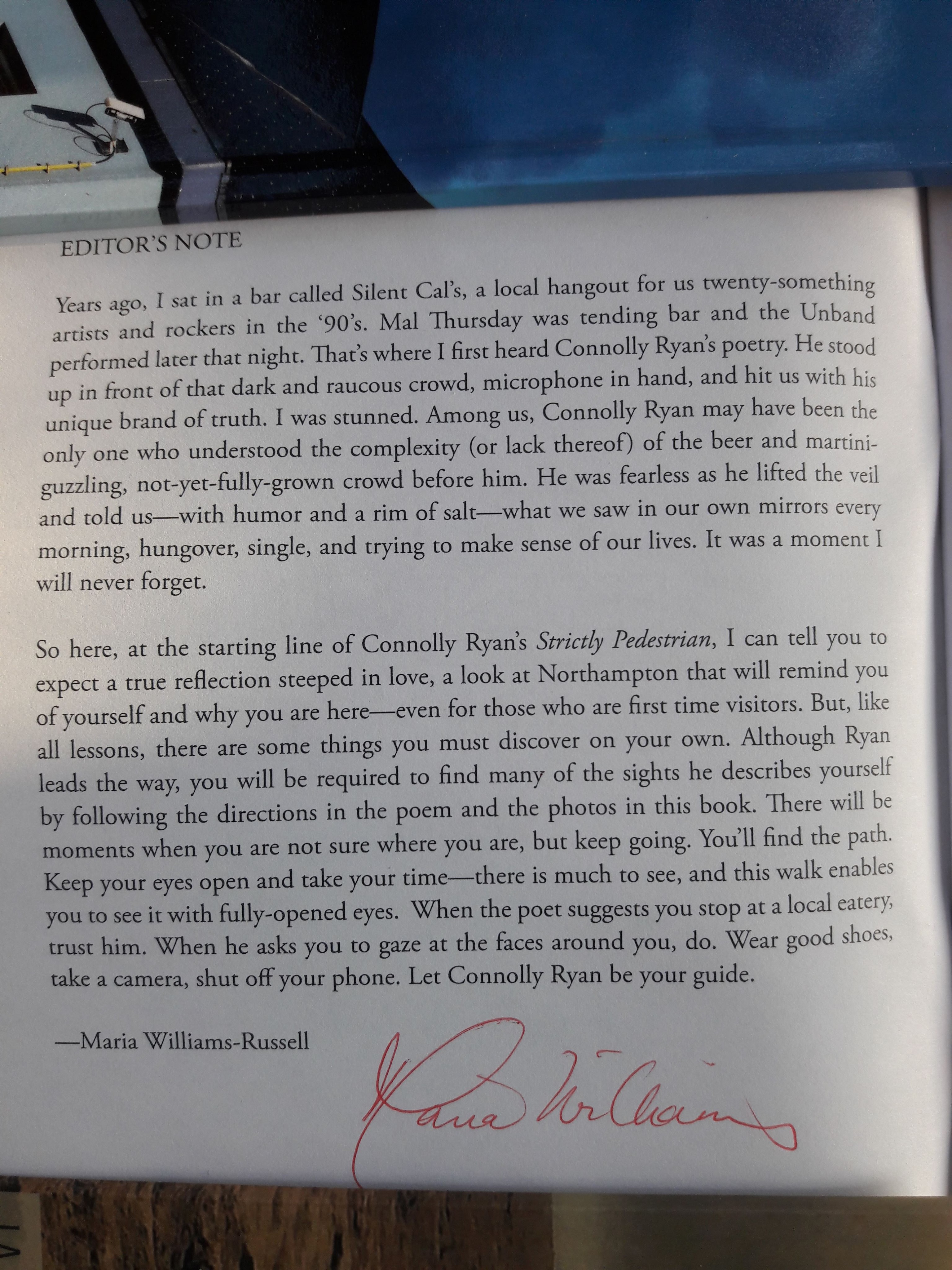 I asked Maria to sign the page with her “Editor’s Note,” and she did, but I could tell she thought the signing a bit silly since she wasn’t the author, and I continued my saunter.