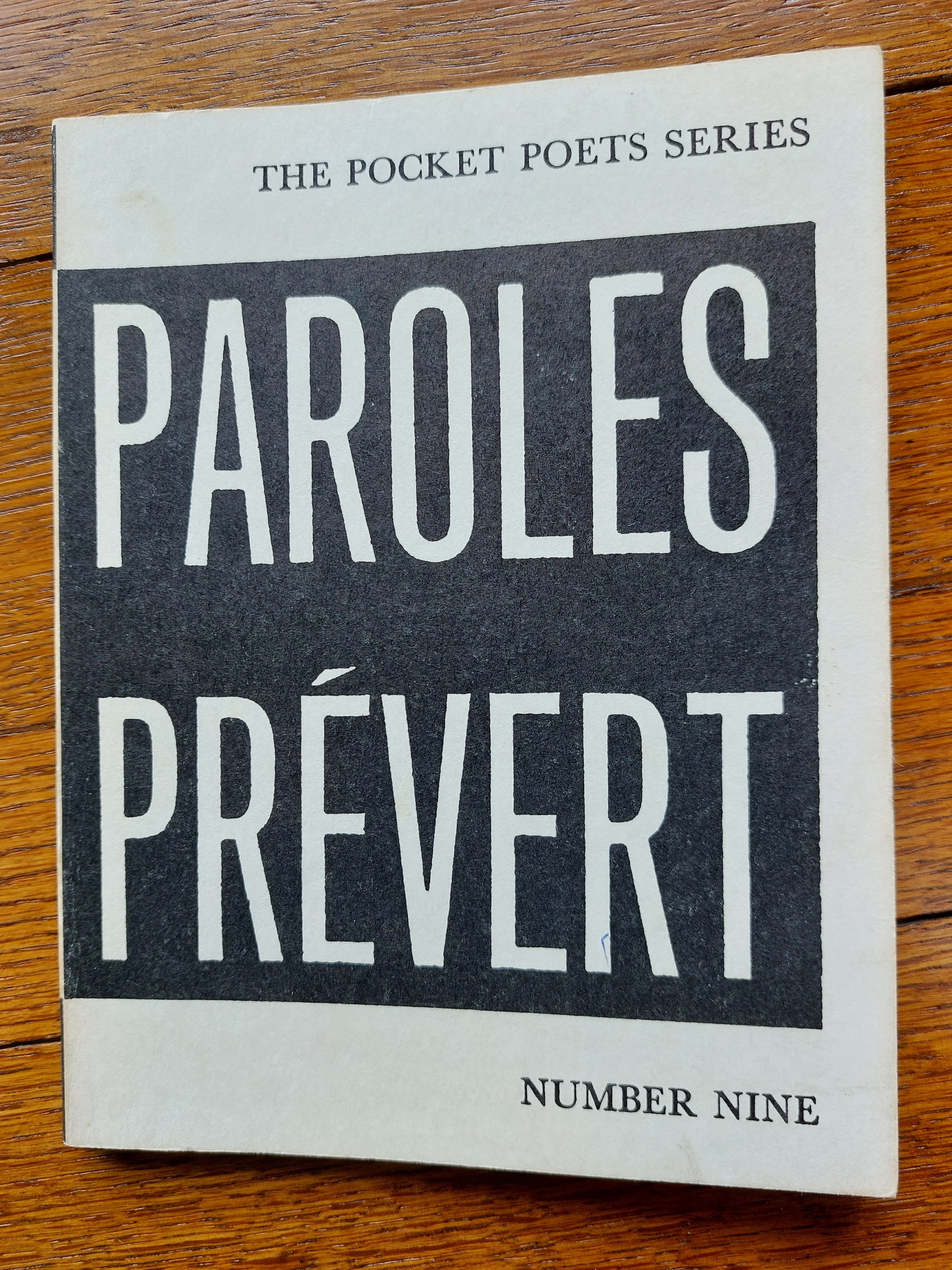 First published 1946, copyright by Les Editions du Point du Jour, Paris, 1947. First published in this edition: July 1958, by arrangement with the Librarie Gallimard. My copy is sixth printing February 1968. Number Nine in The Pocket Poets Series published by City Lights Books, 261 Columbus Avenue, San Francisco, California, U.S.A. 94133. Translated with Intro. Note by Lawrence Ferlinghetti (San Francisco, 1964). From the Intro: “I first came upon the poetry of Jacques Prevert written on a paper tablecloth in St. Brieuc in 1944” (3).