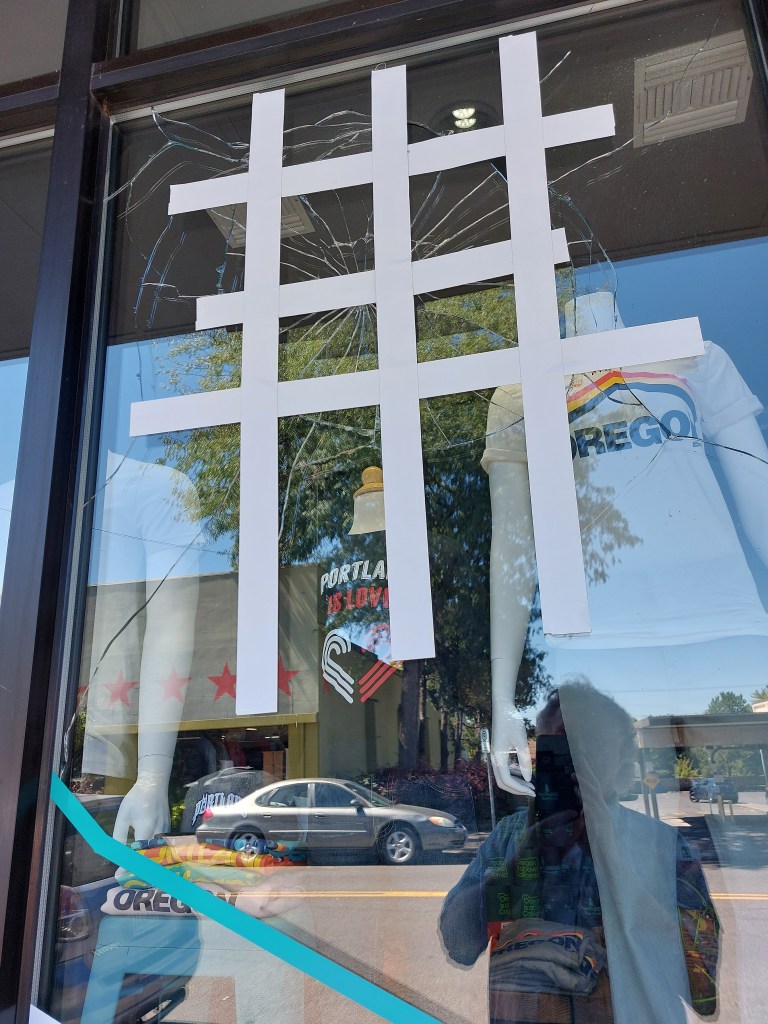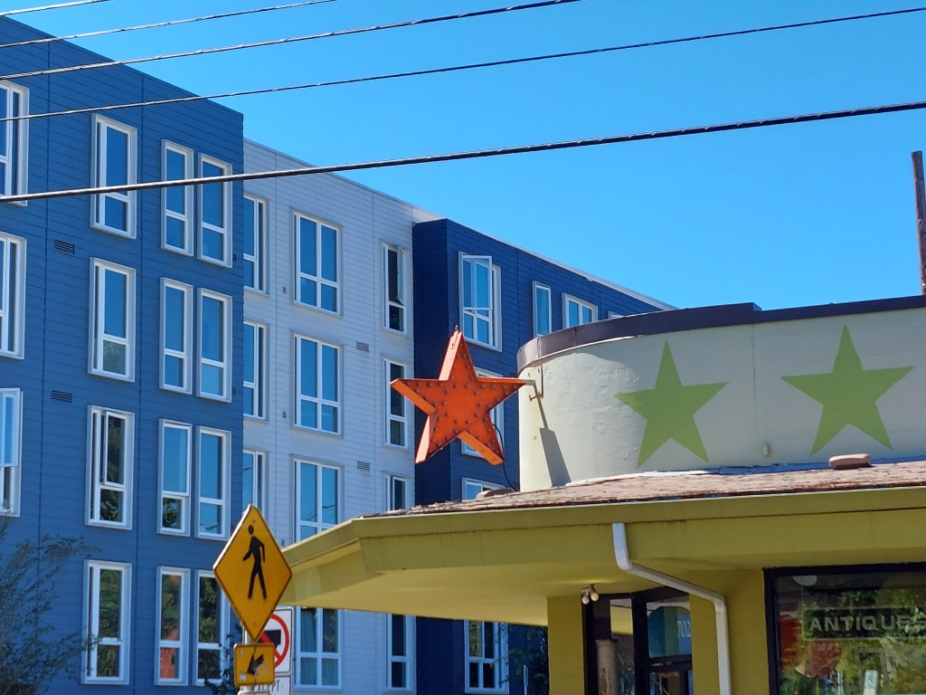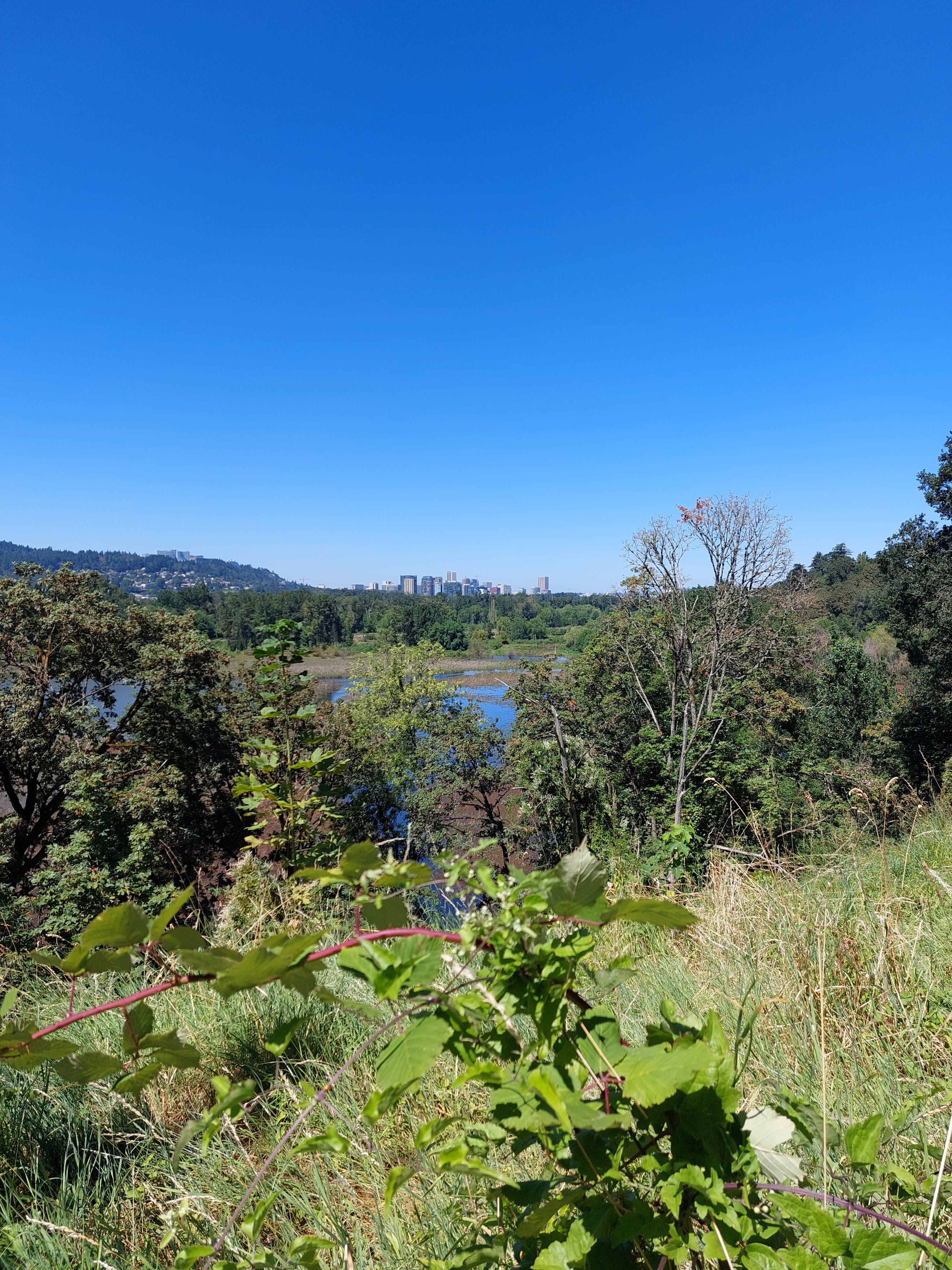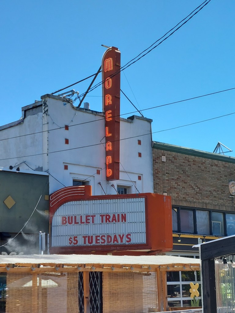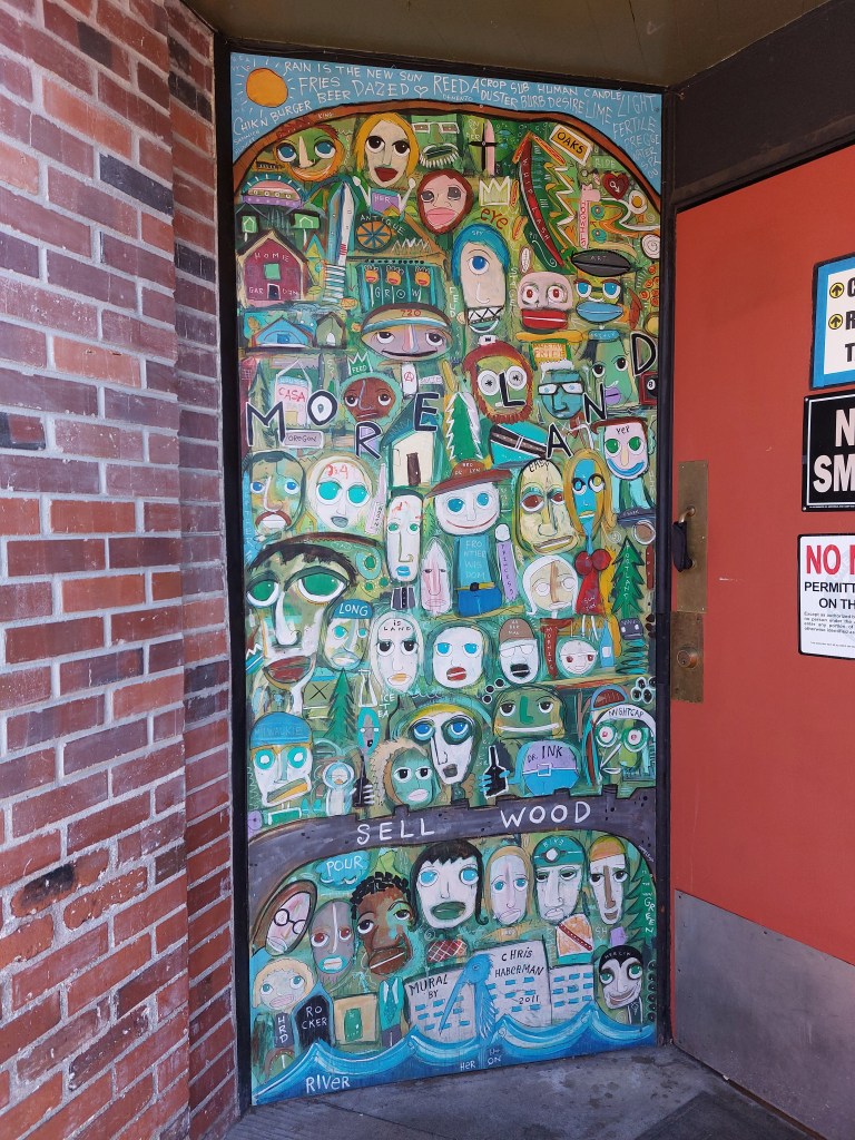 Yesterday, we cruised on foot an antique, theatre, and tavern storied section of Sellwood then drove to the north facing cliffs where we looked across Oaks Bottom, where still lives lively the Oaks Amusement Park, “where the fun never ends since 1905,” the Oaks Park Roller Skating Rink, East Island, Hardtack Island, Ross Island, and across the Willamette River and above the trees to the tops of the taller downtown Portland buildings, looking smaller than nature in the distance.