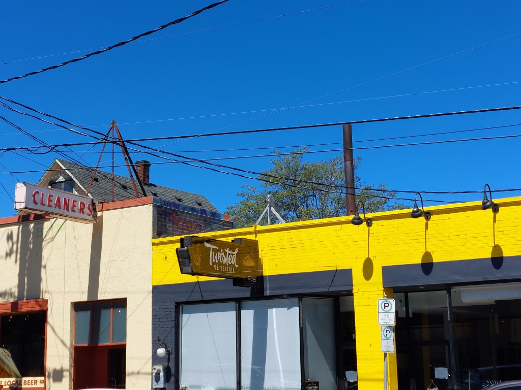 In a similar sense, all photography might be considered fiction. Certainly that view of Portland above is only distantly related to a view of what’s going on in the streets below and between those tall buildings. One problem is how quickly things change, grow, recede. But photographs stick, or they used to. Maybe memory itself is a fiction – without which nostalgia couldn’t thrive like it does. Sellwood is currently an interesting blend of the old and new, of change. Imagine a time when it was necessary to build and display a gargantuan grandfather clock on the street. Did no one carry a watch? Today it’s one of the local antiques, and like a true grandfather tells a fiction all day long about what time it is.