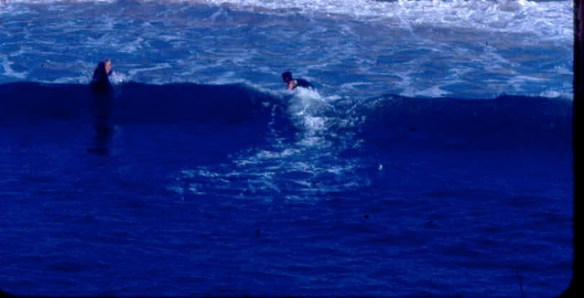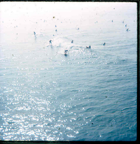 We’d sometimes go down to the Redondo Beach pier, a horseshoe shaped pier. The waves were never very good there, but the view from the back of the waves gives a different perspective on the surfers, here one paddling out, the other dropping down.