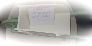 I was up late last night, twittering through “The Late Show,” the best way to watch Letterman, and awoke past the dawn to discover a delightful missive, a kind of plumbing noir note, left inside the TP wheelbarrow, placed atop the closed loo. The empty wheelbarrow was a first clue to the mishap that must have unfolded in the wee morning hours. The note, pictured above, elegantly written, including exclamation points fore-and-aft a cap rigged Danger, follows, in its entirety: