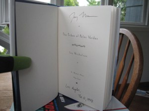 Anyway, as a result of a recent, random conversation that mentioned “Tribes,” I finally did get a copy (at Powell’s, 1st edition hardback, signed by the author, – what a find! – if you like that sort of thing), and read with pleasure Joy Nicholson’s book. And the sky blue walls of Medina’s Palos Verdes are unventilated, much of the surfing takes place at night, and the sport is infused with a noir spirit. I was reminded of Kem Nunn’s surf-themed books, “Tijuana Straits” (Scribner, 2004) for example, which I did read when it first came out. The reader is asked, in both books, to suspend judgement with regard to certain aspects of surfing and local conditions. It’s unclear how, for example, surfers in Joy’s book could possibly be seen from the front window of her house; likewise, the last wave Nunn’s surfer-hero rides, across the U. S. and Mexico boundary, peaks with poetic license. In both books, surfing is as much figurative as literal.