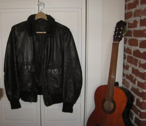 Caroline Knapp’s short article with a long title, “Why We Keep Stuff: If You Want to Understand People, Take a Look at What They Hang On To,” is stuffed with stuff. The word stuff appears 28 times in the three page, short essay. The topic turns on a reflection, moving from funny to serious: yes, we keep stuff we no longer need or can no longer use, but to rid ourselves of our old, useless and cumbersome stuff, is “to say goodbye to a person I used to be.” An example used to illustrate stuff she’ll never be able to use again is her metaphorical pair of jeans: “…tiny, cigarette-legged jeans….” A cigarette is stuffed with tobacco, the paper tight and long and slender, skinny. Cigarettes are lethal, as might be the effort required, as one grows older, and fatter, to stuff oneself into one’s youthful jeans. The metaphorical jeans in my closet hang in the form of my Navy flight jacket. No, I wasn’t a pilot: in the early 70s, I traded my Army field jacket for the flight jacket with a ship’s supply sergeant. I wore it for years, and I remember when I stopped wearing it, a few years after I got a desk job. “I grow old … I grow old …,” Prufrock said, “I shall wear the bottoms of my trousers rolled.” I purchased the guitar in the photo at the top of this paragraph about 40 years ago, for $25. I played it until I first started taking classical lessons, around 1980, but set it aside when I got a new Takamine (C132S, built in 1977 – I bought it used). The much cheaper Orlando, the guitar in the photo, is now a take-to-the-beach guitar, but otherwise does not get played, but it goes with the jacket, which is to say, I’m not ready to get rid of either one. According to Knapp, that should help you understand me.