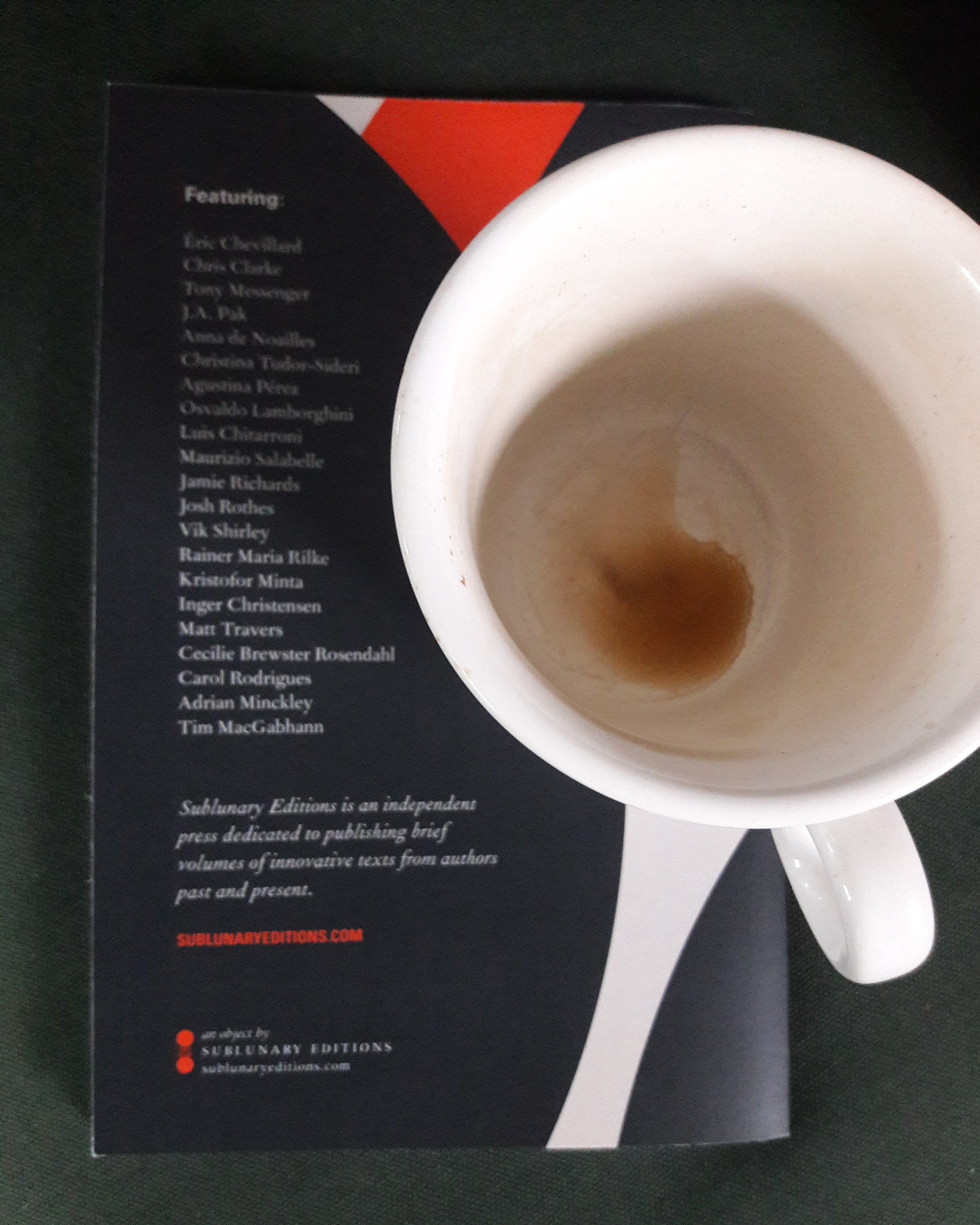 Firmament is edited by Jessica Sequeira, a translator of Spanish texts who has also written a few original books, one of which, “A Luminous History of the Palm,” was published in April, 2020 by Sublunary. I put up a short review of that book here at the Toads back in July. In her “Editor’s Note” to Firmament No. 1, Jessica mentions several journals as examples of like, and liked, precursors, including Sur, 291, Der Sturm, and Claridad. The first issue of Firmament contains poetry, short fiction and excerpts, interviews, and nonfiction and columns – from an international cast of writers and translators. I count 23 contributors, 14 sections, in the 63 pages. I find that remarkable (and so I remarked on it). There is also a page devoted to drawings of a cat creature (tyger?), but it’s uncredited (but it appears to be from the cover of the forthcoming Chevillard book). Another page is devoted to a preview of the upcoming April, Spring 2021 issue of Firmament, and another page listing more Sublunary objects forthcoming for 2021. And a page of “Endnotes.” The issue contains a striking color scheme of red, white, and black. Clearly the editors are serious and professional, busy, planning ahead, with dedicated resources and action plans.