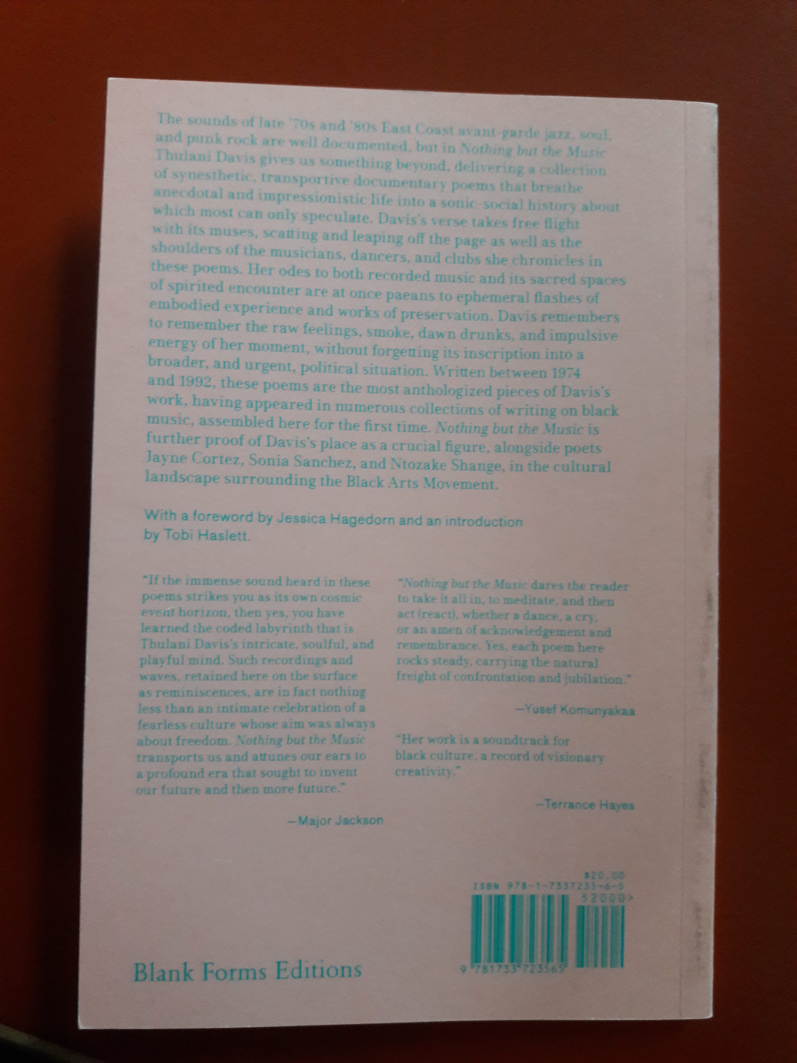 “nothing but the music” (2020, Blank Forms Editions, Brooklyn) is a kind of compilation, a box set, of pieces composed by Thulani Davis over the years 1974 to 1992, lines written while listening to live music or reflecting on the experience of an avant garde art form as it’s happening, and before it might be neutered by mainstream commercialization too influenced by those with control of the means of production. Most of the Davis pieces appeared in poetic form in alternative press issues over the years and some were set to music. The scores are informed, and may be read with reference to, performance and theatre, jazz and punk, R&B, and mixed forms or art form synesthesia, the courage and risks found in the places music is born, but the rewards too of achievement, however much that success may appear to some as failure. The music’s codification (its reliability, approvals, its aesthetic argument) might be seen in the cost for a ticket to get in: $20 – for a 63 page paperback, made possible in part by support from the Robert Rauschenberg Foundation and the Andy Warhol Foundation for the Visual Arts.