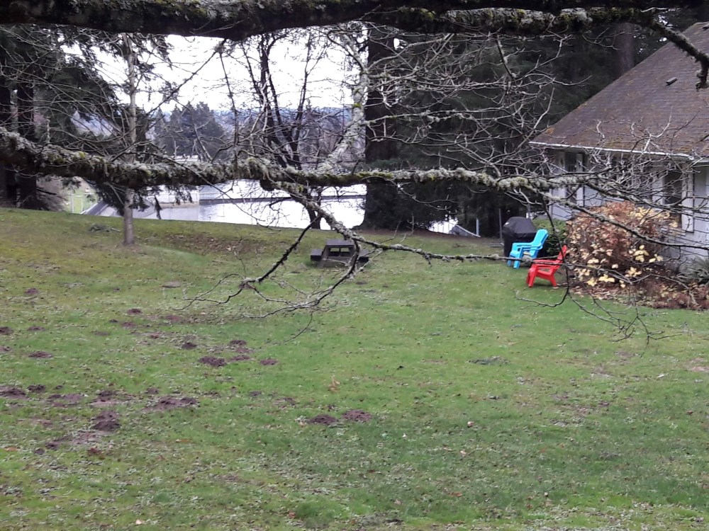 Someone built a labyrinth of branches in the grassy opening to the west-side creek valley. Portlanders love to sit out. In the yard at the west-side entrance to the park, two colorful chairs sit empty.