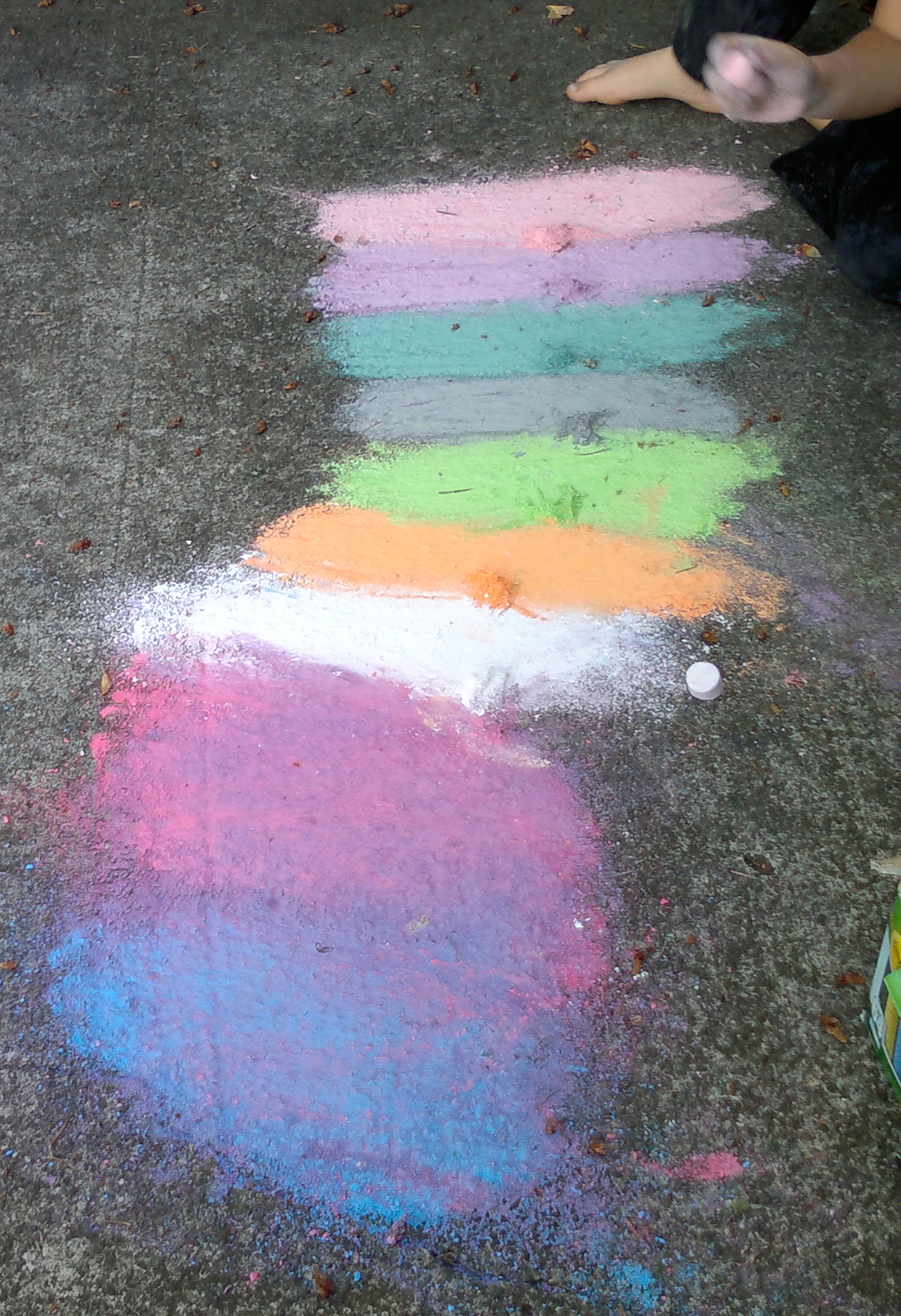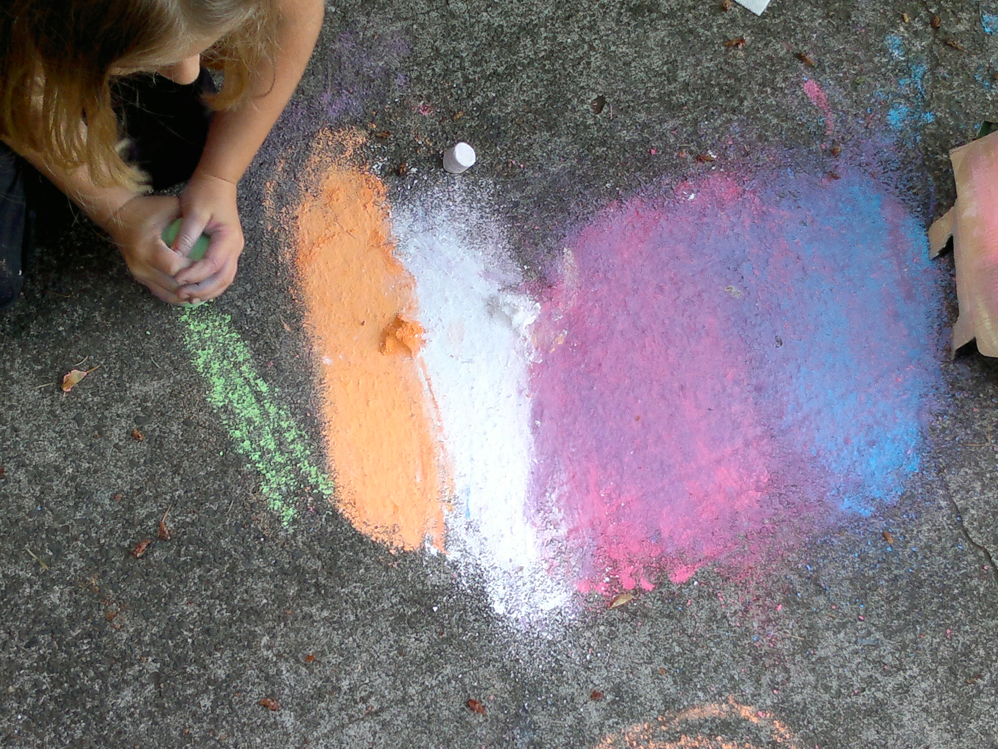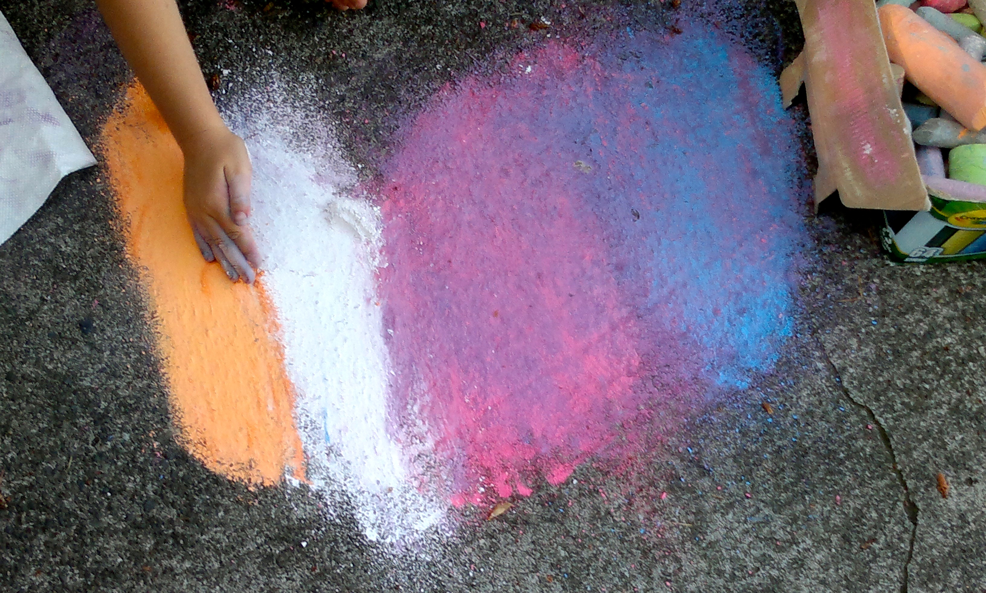 During the day, the drawing grows hot, an illuminated manuscript. The artist takes a break, asks for an ice-cycle stick, kicks back on the grass, considers the remaining supply of chalk, eyes the blank concrete spaces up the block.