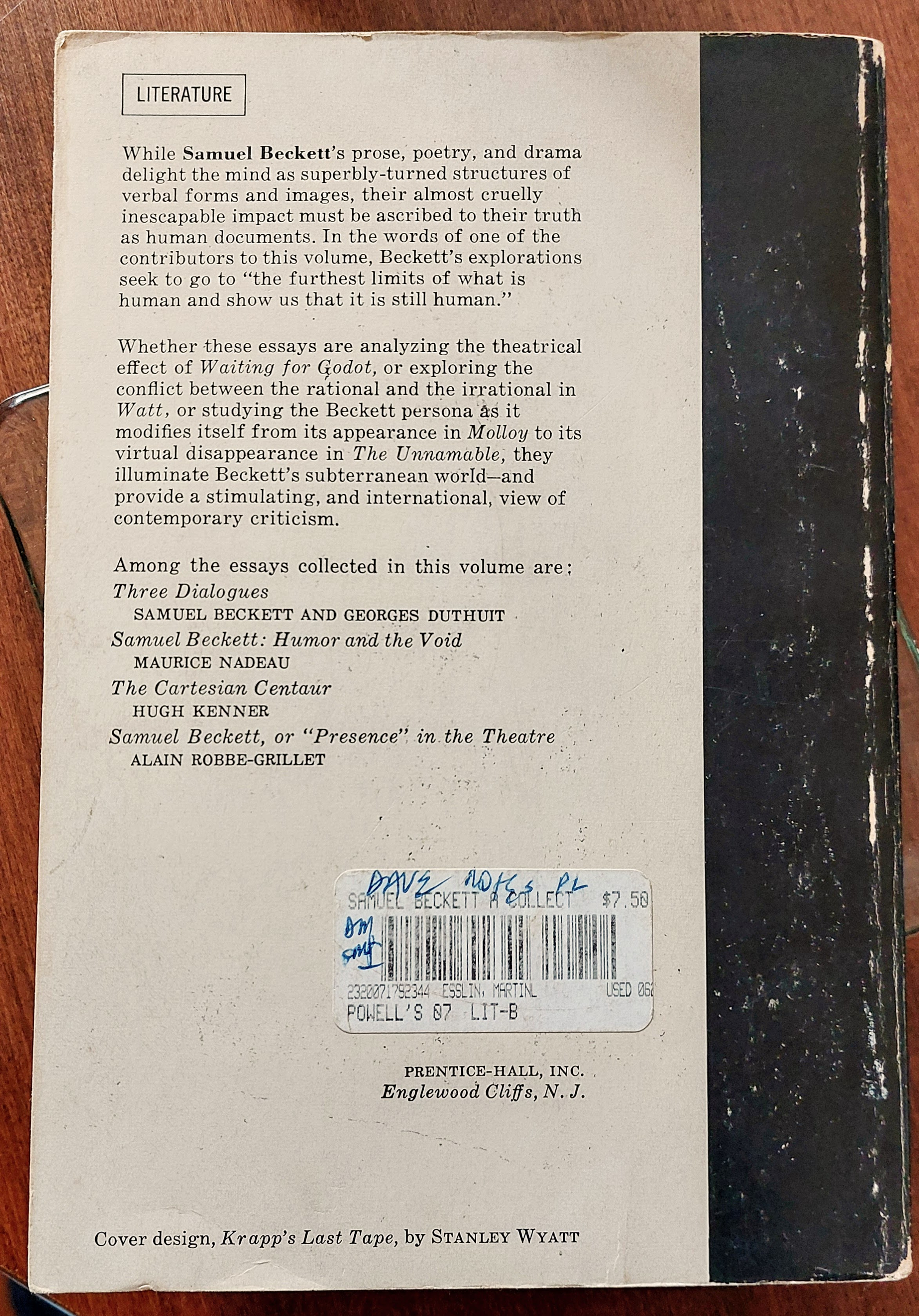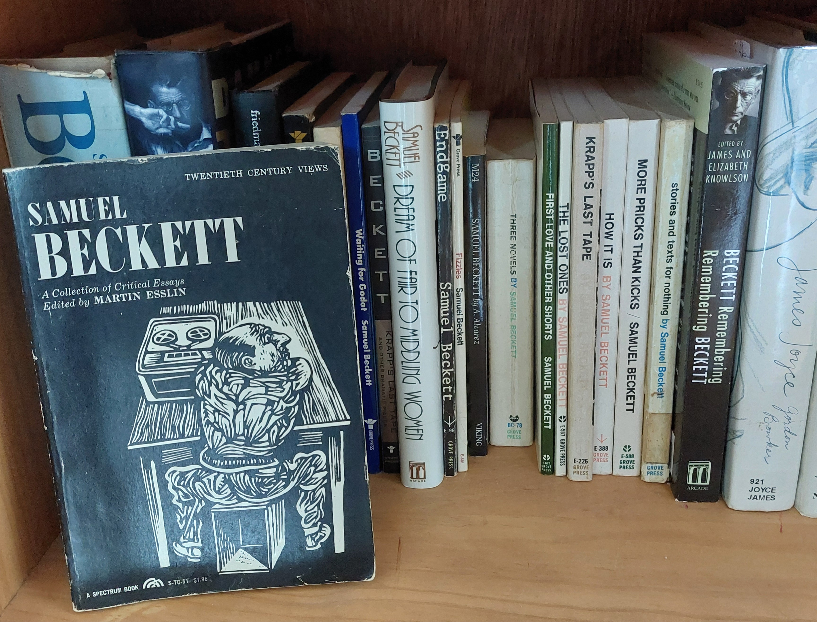 “Samuel Becket: A Collection of Critical Essays,” Edited by Martin Esslin, Prentice-Hall, A Spectrum Book, 1965. Includes “The Beckett Hero” by A. J. Leventhal, a lecture at Trinity College June 1963, and “The Private Pain and the Whey of Words” by John Fletcher, a lecture given at Durham U England November 1964.