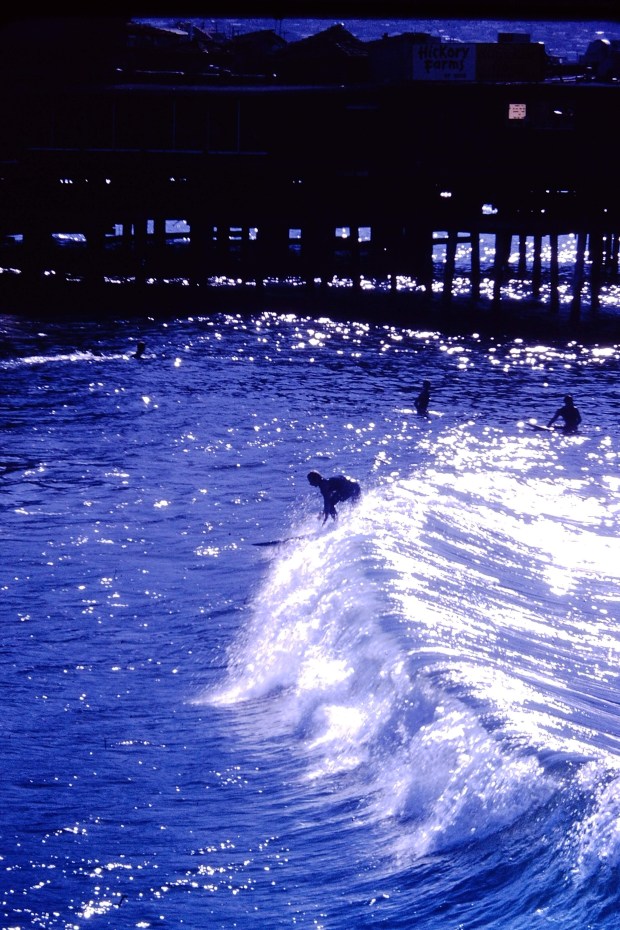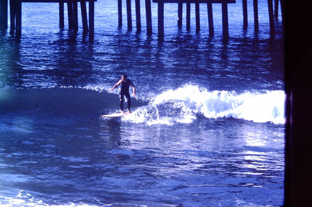 Surfing at Horseshoe Pier in Redondo Beach CA, 1969. Unknown surfer. 35 mm Ektachrome slide taken with an Exakta 500 with 120mm portrait lens.