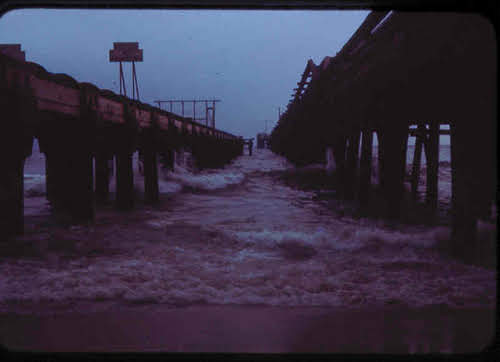 Grand Jetty with old pilings uncovered by a very low tide, early 70s.