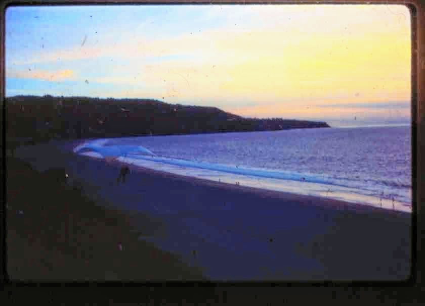 We never tired of going down to the beach, in the mornings to surf, in the afternoons to boogie, in the evenings to walk, to catch the sunset. I bought a used Exakta 500 for surfing photos. The 50mm lens was too small, so I bought a used 120mm portrait lens. After the sun went down we sat out in the backyard and watched a slide show on the side of the garage wall.