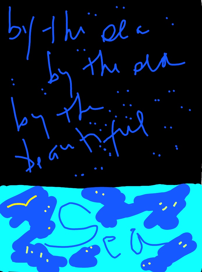 And again birds, before a song breaks the spell of the litany. Something lonely about the bird drawings. The birds are not in nature, or even in the city, but alone, each its own poem, each drawing its own poem, saying the same thing, but in different expressions. Where do we see these birds? In sky that is like a sea: grey-green; blue-grey; slate; cliff chalk white.