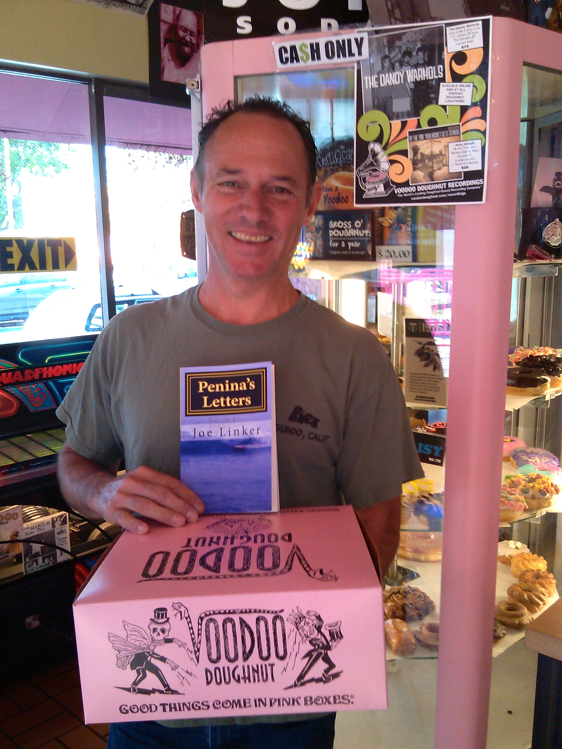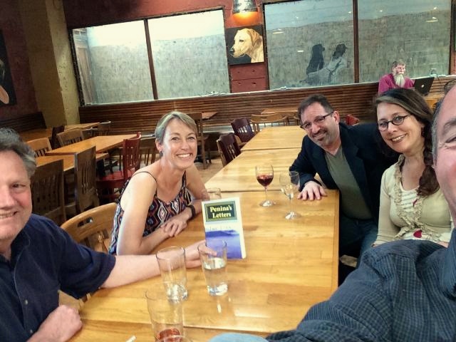 Also meanwhile, my Facebook friends had a bit of fun posting pictures of their copy of the book, being read or held or posed at various locations, including Mexico, France (on a Kindle in Paris), Montana, airplane to Los Angeles, dashboard of car in Sellwood, Studio City, Minneapolis airport bookstore, in the woods above Los Angeles, on an office desk near the Willamette, a deck in Bend, Voodoo Doughnuts, a pool room in Portland’s Hawthorne neighborhood, a bike repair apartment in Seattle, outside the Mojave Cancer Center, a very cool San Francisco pad, a neighbor’s house on 69th, a laptop with Instagram photo in Aloha, another sitting out in the yard on a warm day on the west side, on a table with the rest of the mail in Ione, on a shelf at Em’s with her cookbooks, Warren’s place in North Portland, a desktop in El Segundo, on a quilt in Barstow, and please let me know if I missed one, because what a great marketing idea!