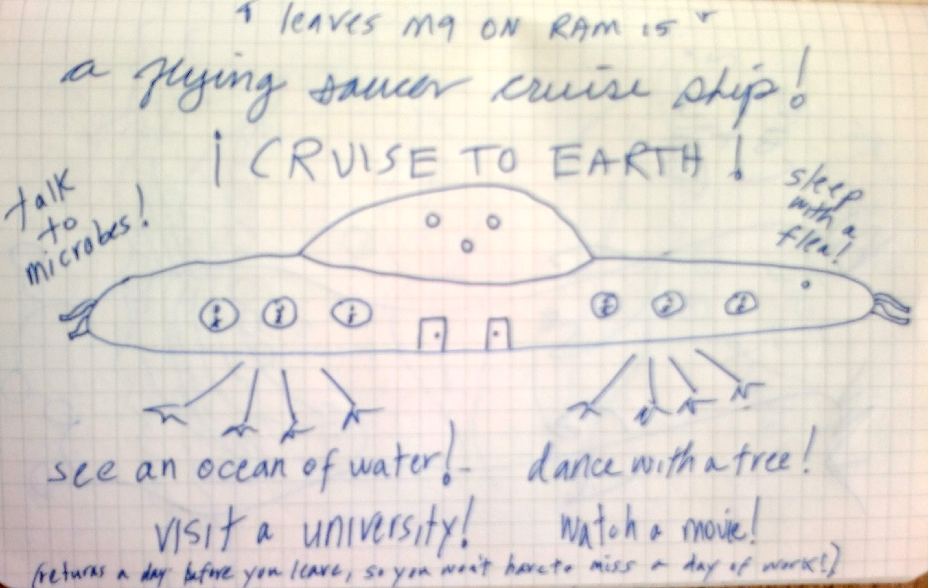 Cramble: “Making it difficult to know how to pack. In any case, how will you get back to Mkgnao!9 if the hep space cats don’t come pick you up again?”