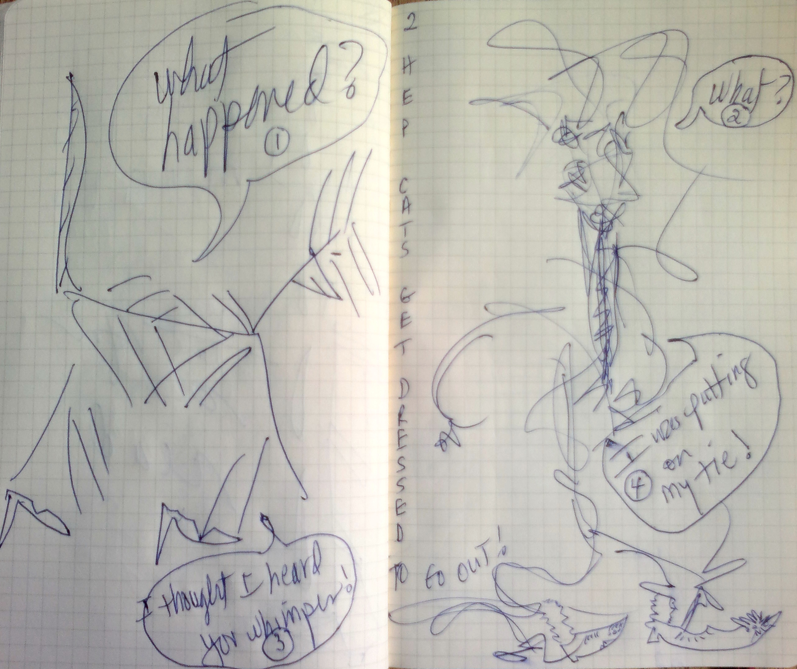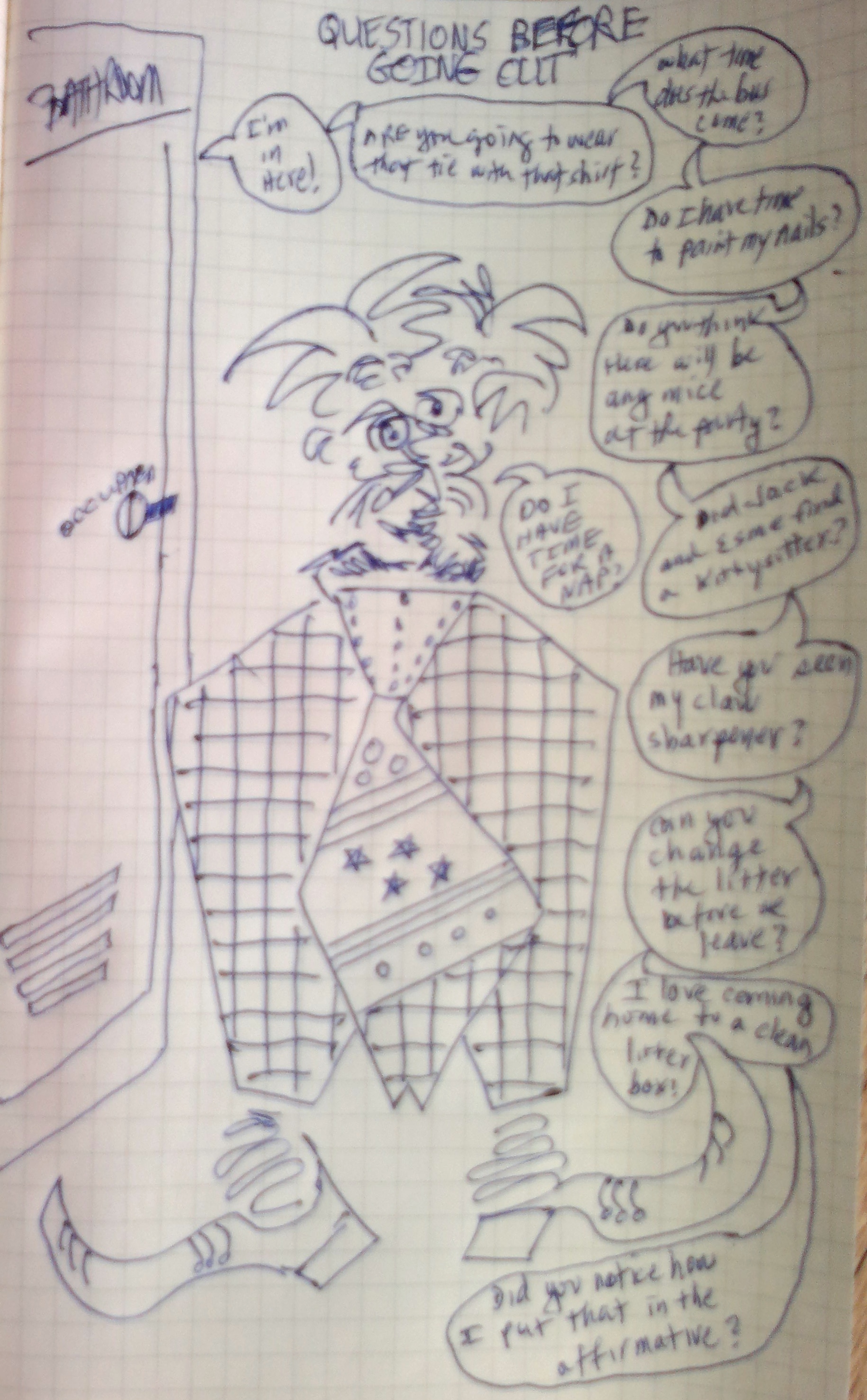 Questions Before Going Out: Scamble – I’m in here! Are you going to wear that tie with that shirt? What time does the bus come? Do I have time to paint my nails? Do you think any mice will be at the party? Did Jack and Esme find a kittysitter? Have you seen my claw sharpener? Can you change the litter before we leave? I love coming home to a clean litter box. Did you notice how I put that in the affirmative? Cramble: Do I have time for a nap?